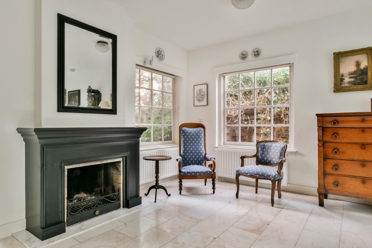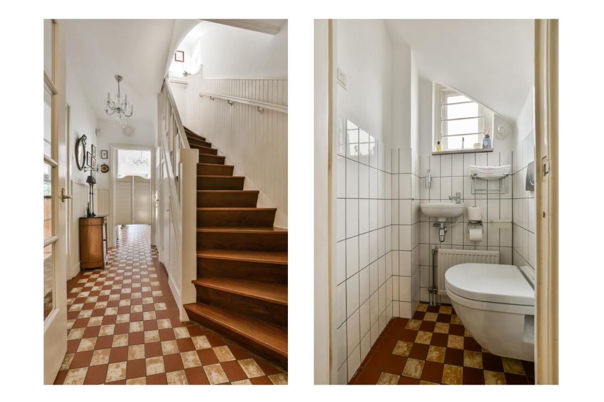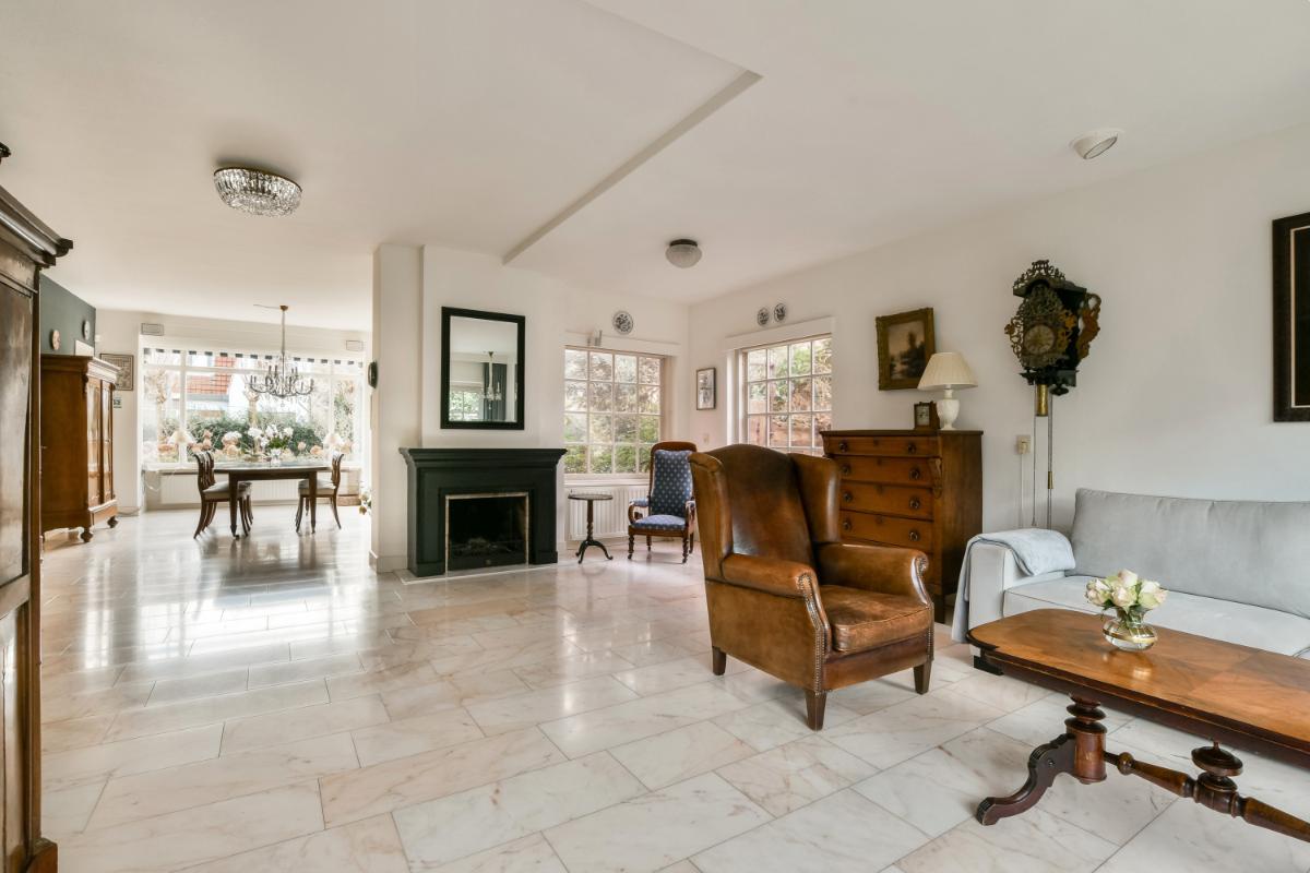 Layout: The house is accessible via the green front garden. From the entrance, the spacious hall with atmospheric original tiles and a stately staircase is accessible. Here, there is also a storage cupboard under the stairs and a modern floating toilet. The hall provides access to the living room and the kitchen. The extended living room is generously sized and offers a dining room with a bay window at the front and a spacious seating area at the rear, featuring a fireplace and French doors leading to the back garden. The entire living room is finished with a beautiful marble floor with underfloor heating.
