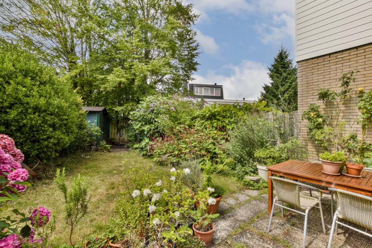 De diepe en brede achtertuin van circa 80 m² ligt op het zuidwesten waardoor in de zomer de zon al in de loop van de ochtend in de tuin komt. De tuin is ook ruim genoeg voor nog een eventuele uitbouw aan de achterzijde van de woning. Achter in de tuin bevindt zich een vrijstaande houten berging. Er is tevens een achterom aanwezig. De tuin is op dit moment grotendeels voorzien van een terras, graszoden en vaste beplanting.