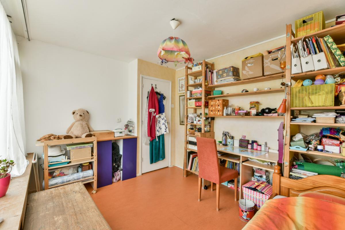 The open-plan kitchen has a corner layout with both wall and base units. The kitchen is also equipped with an extractor hood, a freestanding stove with an electric oven, and a freestanding refrigerator. A door also provides access to the extension, which is also accessible from the former garage and features a skylight. The extension is currently used as a hobby/study room.