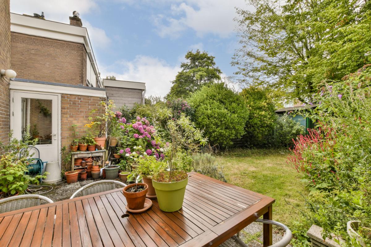 De diepe en brede achtertuin van circa 80 m² ligt op het westen waardoor in de zomer de zon al in de loop van de ochtend in de tuin komt. De tuin is ook ruim genoeg voor nog een eventuele uitbouw aan de achterzijde van de woning. Achter in de tuin bevindt zich een vrijstaande houten berging met elektra. Er is tevens een achterom aanwezig. De tuin is op dit moment grotendeels voorzien van een terras, graszoden en vaste beplanting.
