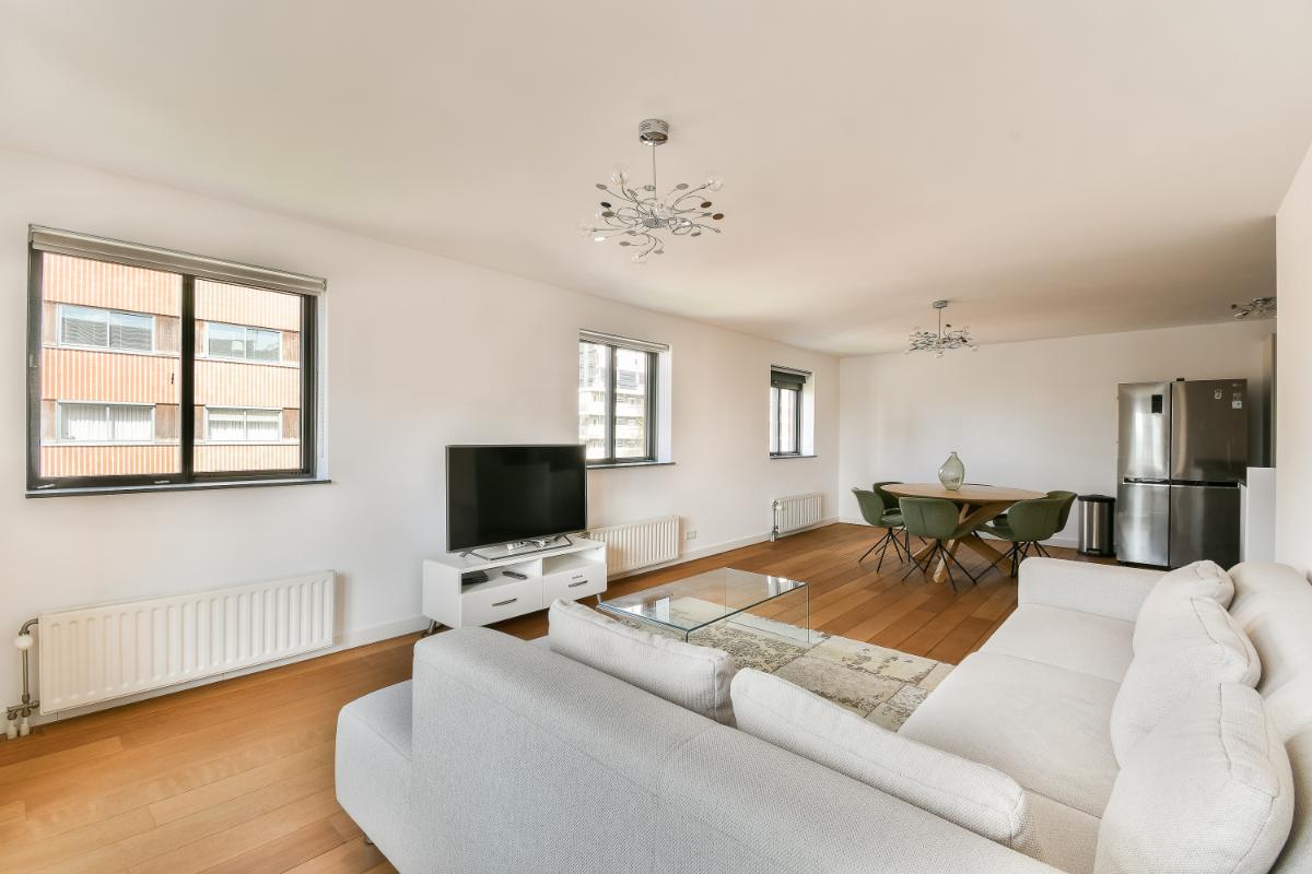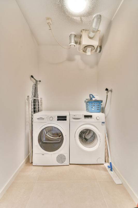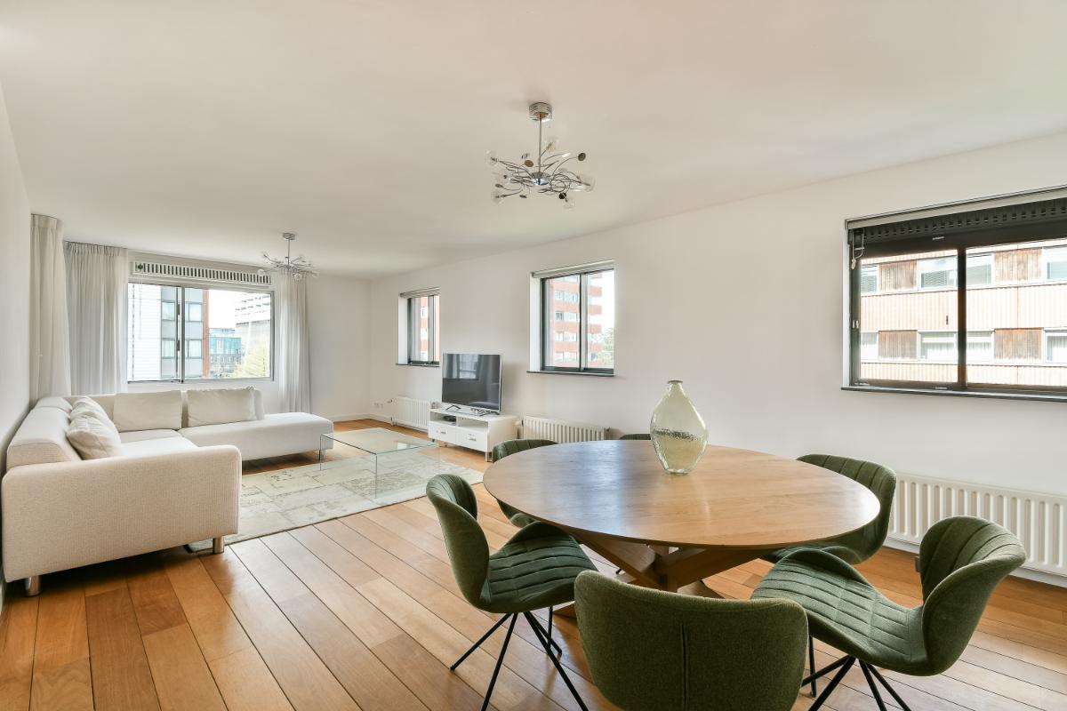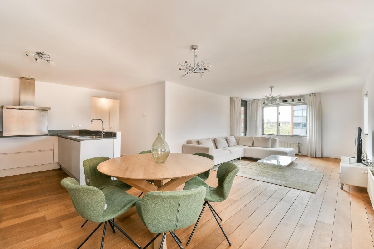 The balcony is accessible via an access door. The balcony and the living room face south. The modern kitchen is U-shaped and features ample storage space in tall cabinets, drawers, and lower cabinets. The built-in appliances include: a 5-burner induction hob, an extractor hood with splash guard, an eye-level combination oven, a dishwasher, and there is a separate microwave and an American-style refrigerator. The open kitchen is finished with a composite worktop. The two bedrooms are good size. The second bedroom has access to the balcony via a sliding door. The internal storage room with connections for the washing machine and dryer, the modern bathroom, and the separate toilet are accessible from the hallway. The fully tiled bathroom is fitted with a shower area, a bathtub, and a washbasin with a vanity unit and mirror. The separate toilet is finished in the same color scheme as the bathroom. Particulars: Living area is 96 m². The surface area of the external storage space is 5.20 m². The surface area of the balcony is: 7.80 m². Volume of the dwelling: 286 m³. Immediate occupancy possible. Year of construction: 2000. All existing furniture and household goods will be left behind. The apartment features 5 circuits, 1 cooking circuit, and 2 residual current devices. The apartment is fitted with uPVC window frames with double glazing. The apartment is equipped with district heating. Hot water is supplied via district heating. The apartment features mechanical ventilation. The property has an energy label A+, valid until March 28, 2033. The service costs are: € 220 per month, excluding heating costs. The Owners' Association is managed by VvE Dienst Nederland The Hague. On December 31, 2024, the total maintenance reserve was approximately € 180,000.