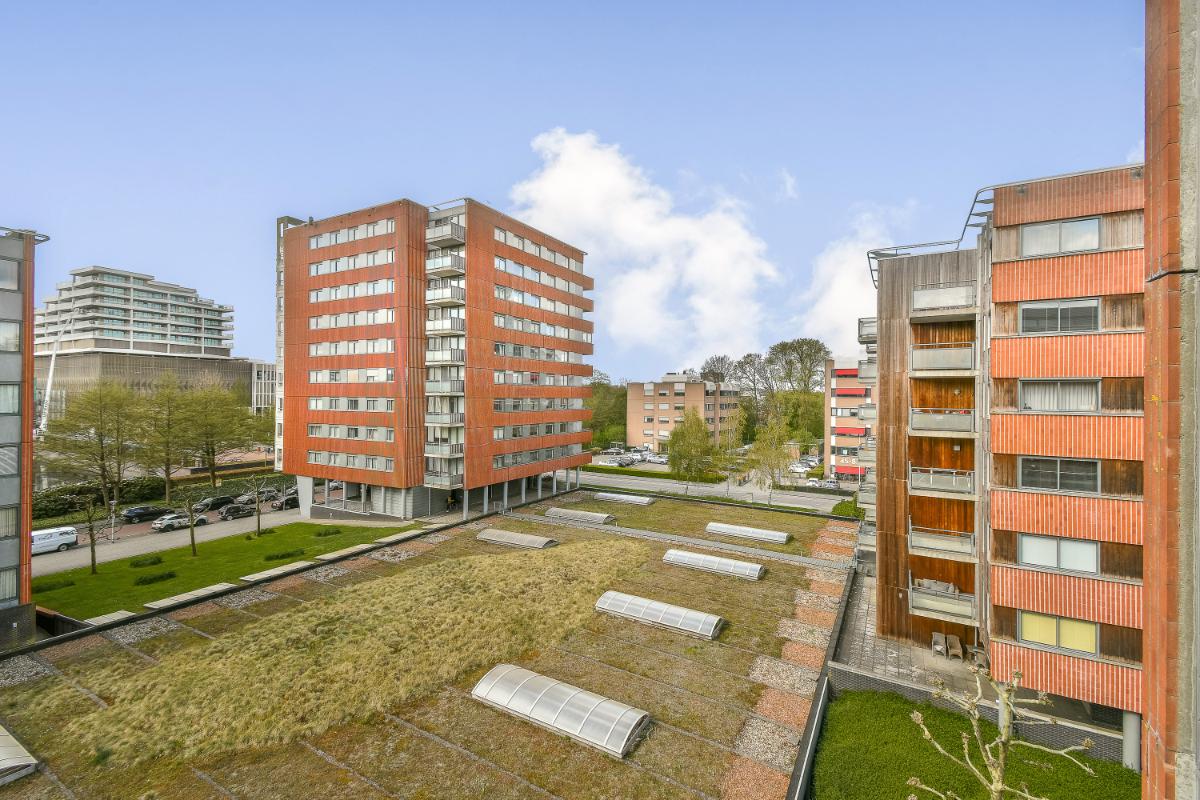 English translation: The spacious 3-room apartment is located on the 4th floor of a modern and well-maintained apartment complex in the center of Amstelveen and features a storage unit in the basement. Additionally, there are two communal bicycle storage units. There is a secure entrance and the complex is equipped with an elevator. The building is excellently situated in relation to Stadshart Amstelveen, within walking distance of shops, museums, theaters, cinemas, and restaurants. With the metro, tram stop, and bus station within walking distance, public transport connections are also excellent. A parking permit system applies around the building.