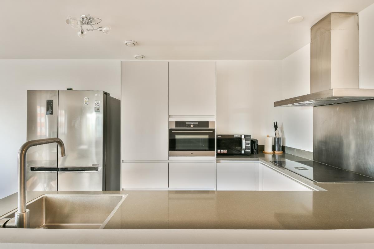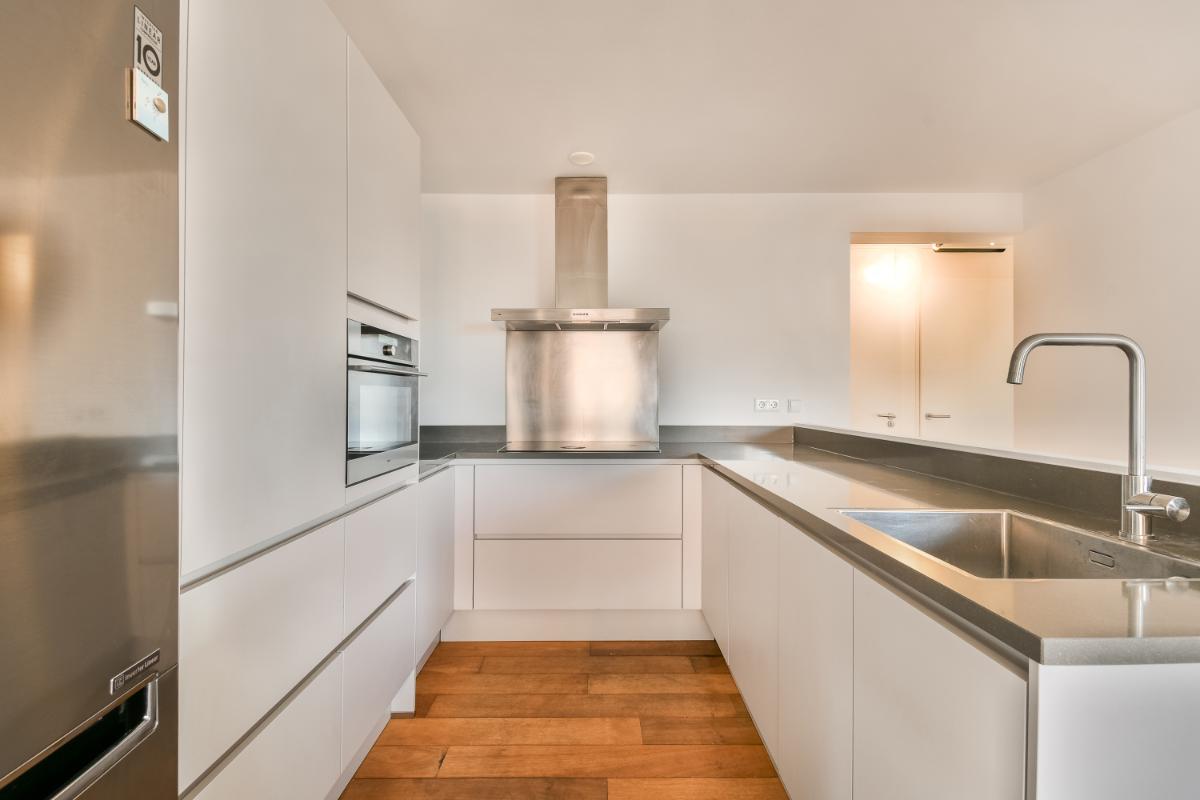 De moderne keuken is in een U-vorm geplaatst en is voorzien van veel bergruimte in hoge kasten, lades en beneden kasten. De inbouwapparatuur zijn: een 5-pits inductiekookplaat, een afzuigkap met spatscherm, een combi-oven op ooghoogte, een vaatwasmachine en er zijn een losse magnetron en een Amerikaanse koelkast aanwezig. De open keuken is afgewerkt met een werkblad van composiet.