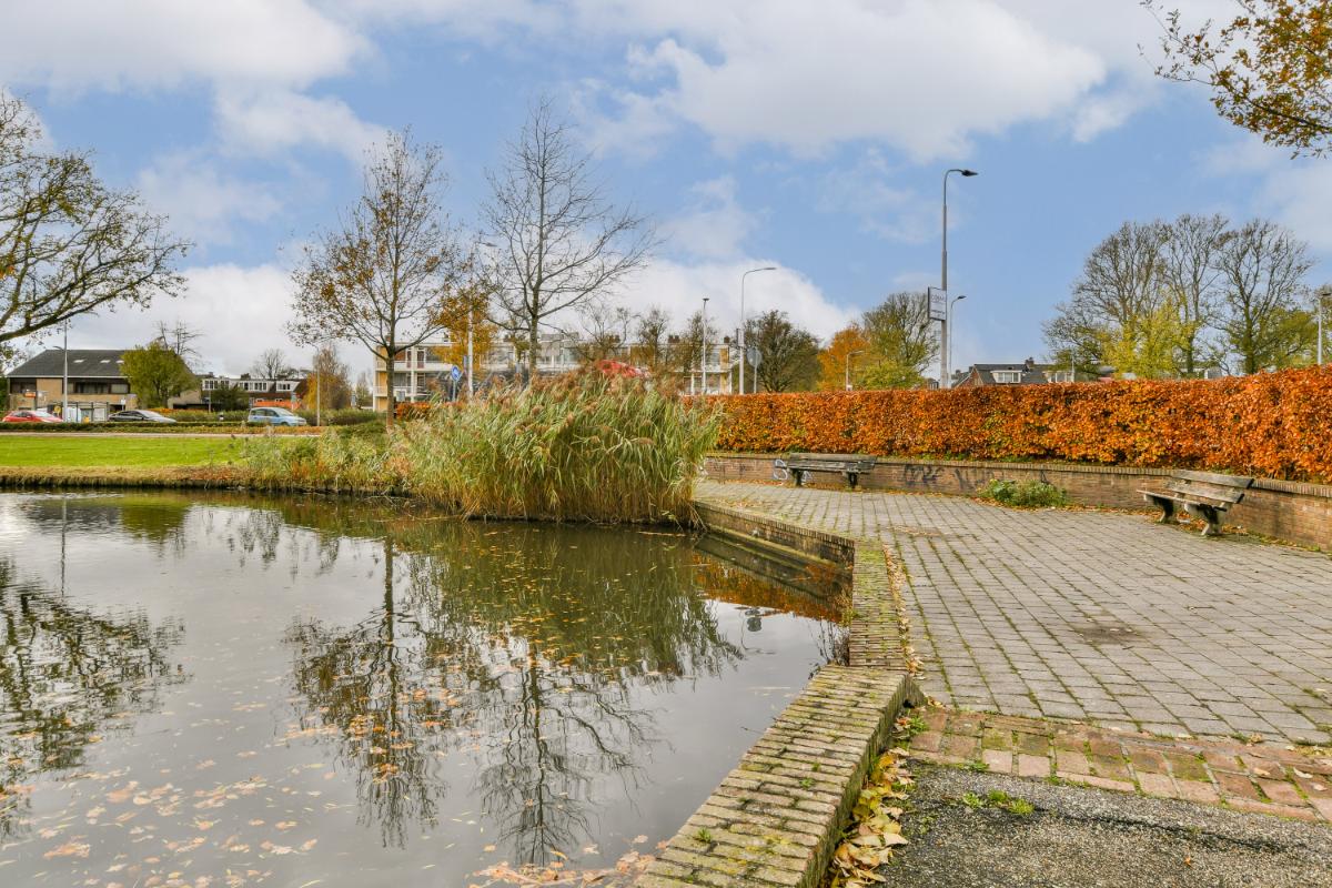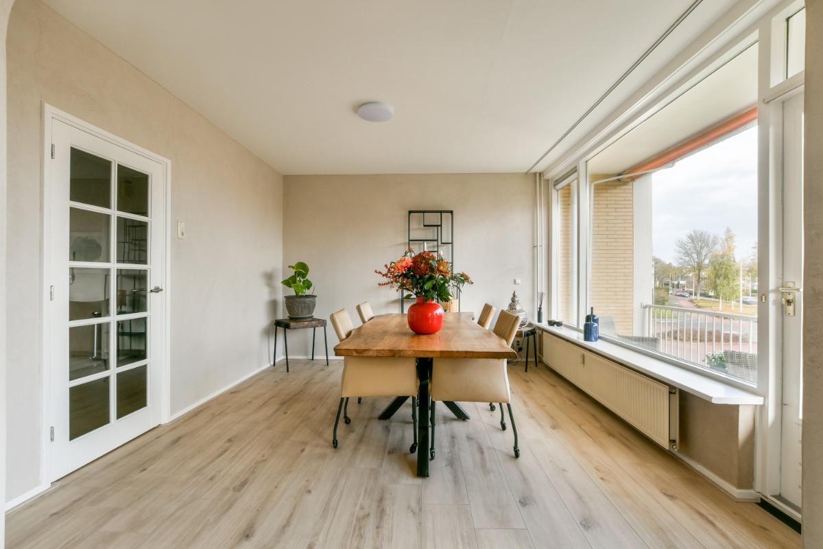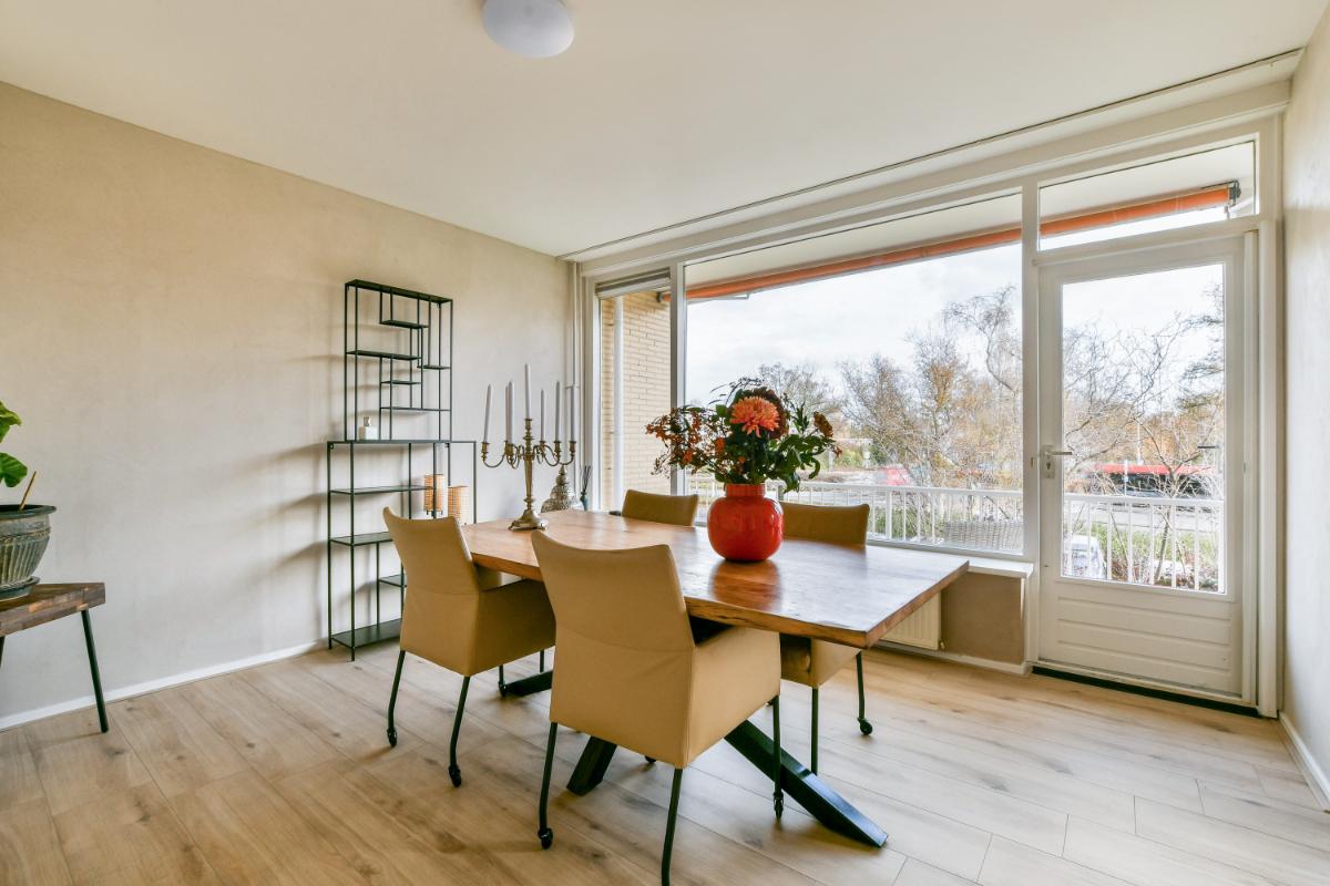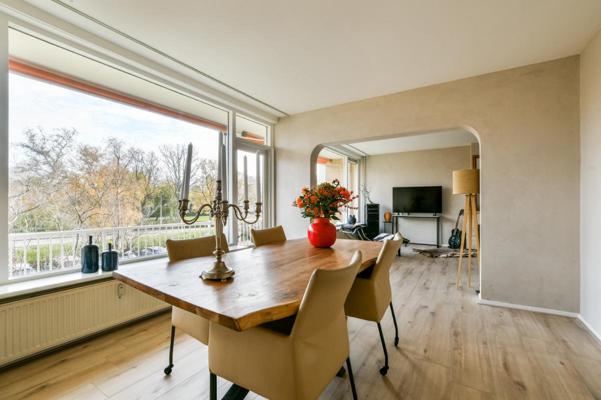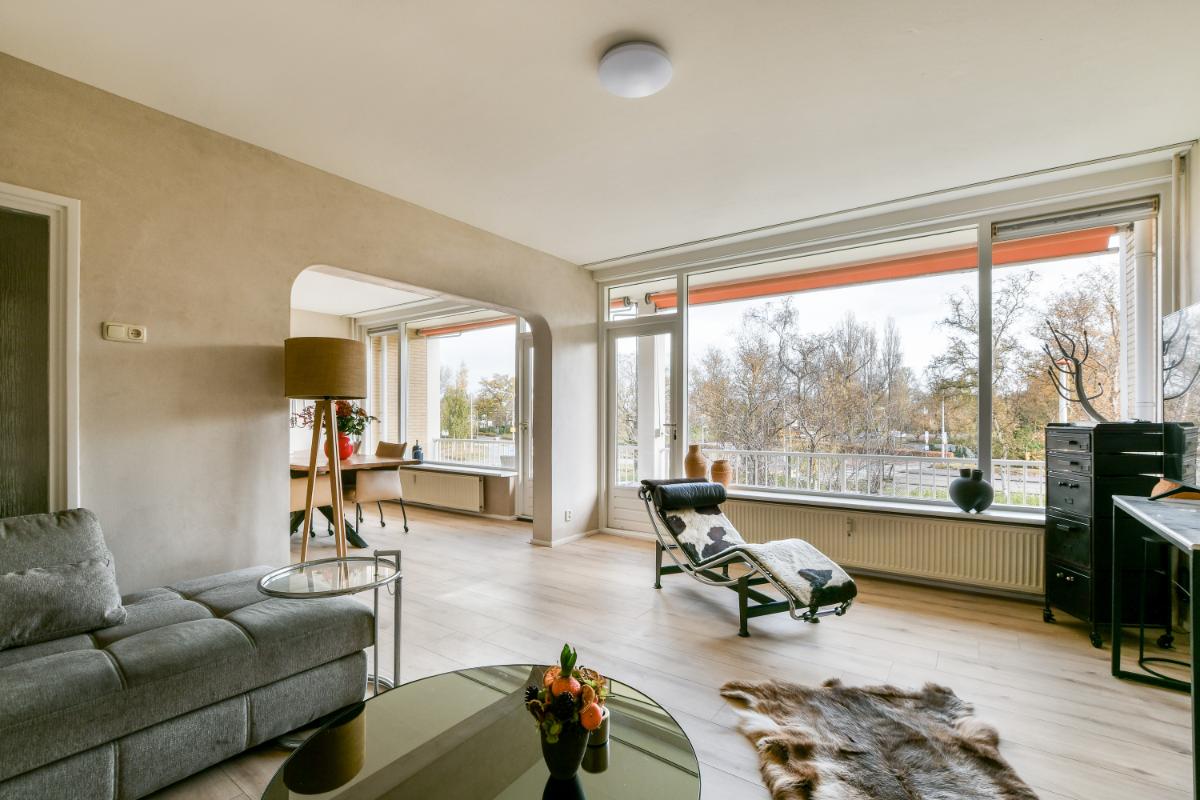 English translation This spacious 3-room apartment is located on the second floor of one of the striking buildings on Keizer Karelweg, featuring a southwest-facing balcony and a northeast-facing balcony. The complex, along with its adjacent "twin" building, was designed by architect Dudok and is a designated municipal monument. The apartment is within walking distance of Amstelveen's city center, with its diverse range of shops and restaurants, the bus station, the Cobra Museum, the theater, the library, and, of course, the lively Friday market.