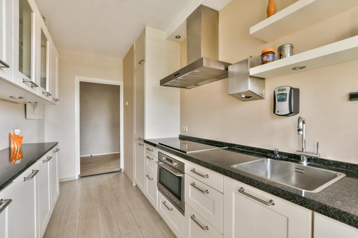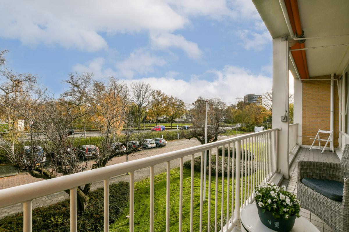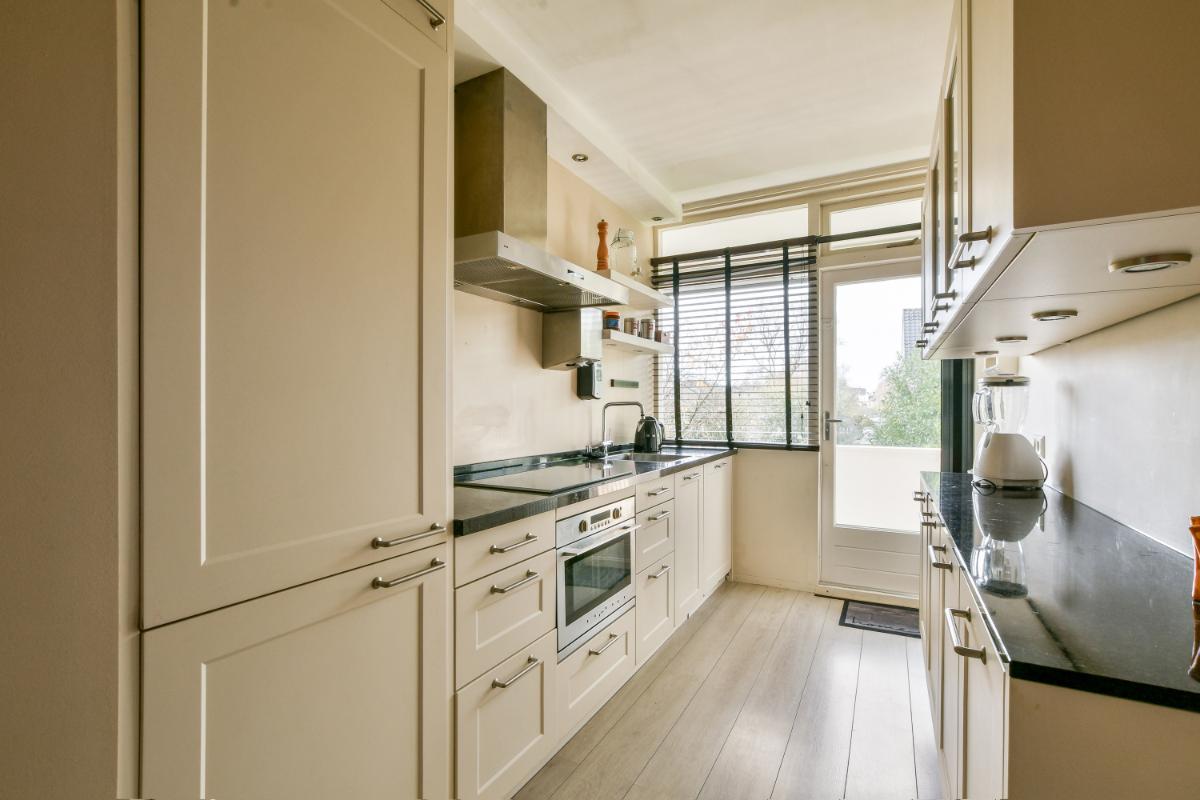 The A9 motorway entrance and exit are just a short distance away. Parking is available in front of the building and in the surrounding area with a permit. Connections to Amsterdam and major roads are also excellent. You can easily reach the Zuidas business district of Amsterdam, the A9, or the A10 motorways, and by bus, you can reach the heart of Amsterdam, Haarlem, or Schiphol Airport in 20 minutes. Various parks and the Amsterdamse Bos (Amsterdam Forest) are also easily accessible by bike or car. Layout: The apartment on the second floor is accessible via a secure entrance with a doorbell panel. The spacious hallway provides access to all rooms in the apartment. The compact kitchen is well-maintained and spacious. It features ample storage space on two sides in upper and lower cabinets and drawers and is equipped with built-in appliances including an electric oven, a ceramic hob, an extractor hood, a fridge/freezer, and a dishwasher. The bright kitchen features black granite countertops on two sides and opens onto the southwest-facing balcony at the rear.