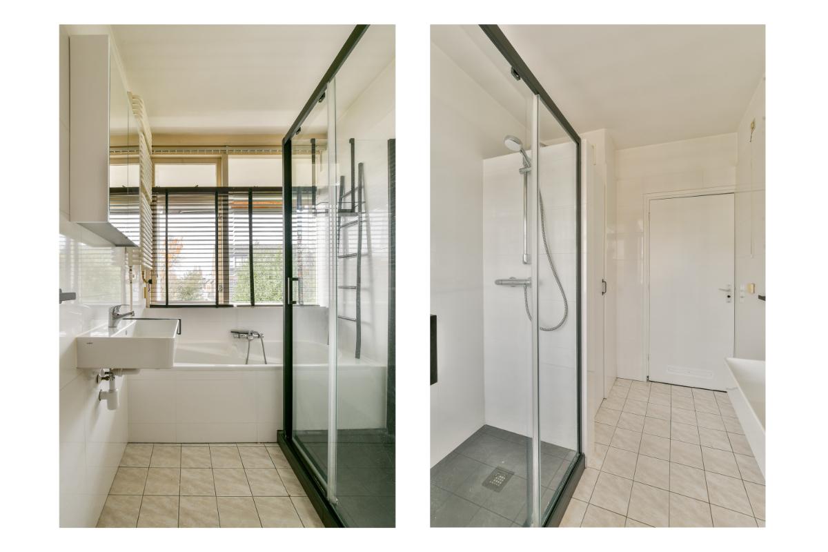 De badkamer is in 2024 geheel gerenoveerd en ingedeeld met een ligbad, een inloopdouche met glazen deur en spatscherm, een moderne wastafel met spiegel en in een vaste kast is de wasmachine en de geiser (Bosch)weggewerkt.