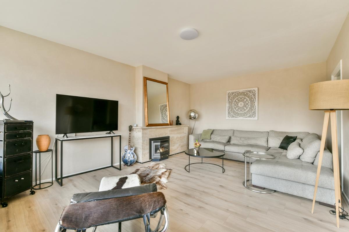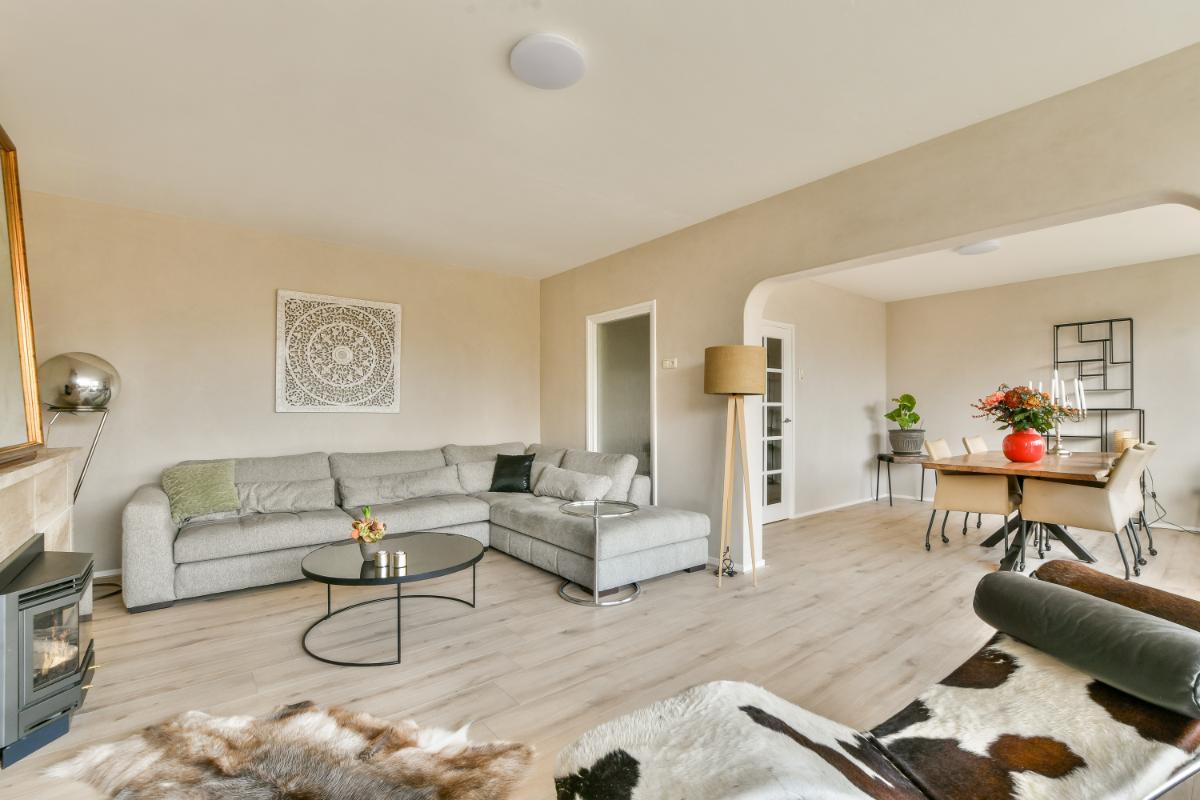 De woon- en eetkamer bevinden zich aan de voorzijde en hebben allebei een toegangsdeur naar het balkon. Het balkon heeft een vrij uitzicht en is voorzien van zonneschermen. De woning wordt verwarmd door radiatoren maar er is in de woonkamer ook een gezellige gashaard te vinden. De hal en de woonkamer beschikken over een in 2022 nieuw gelegde pvc-vloer in een warme kleurstelling en nieuw gestuukte muren met micro stuuk.