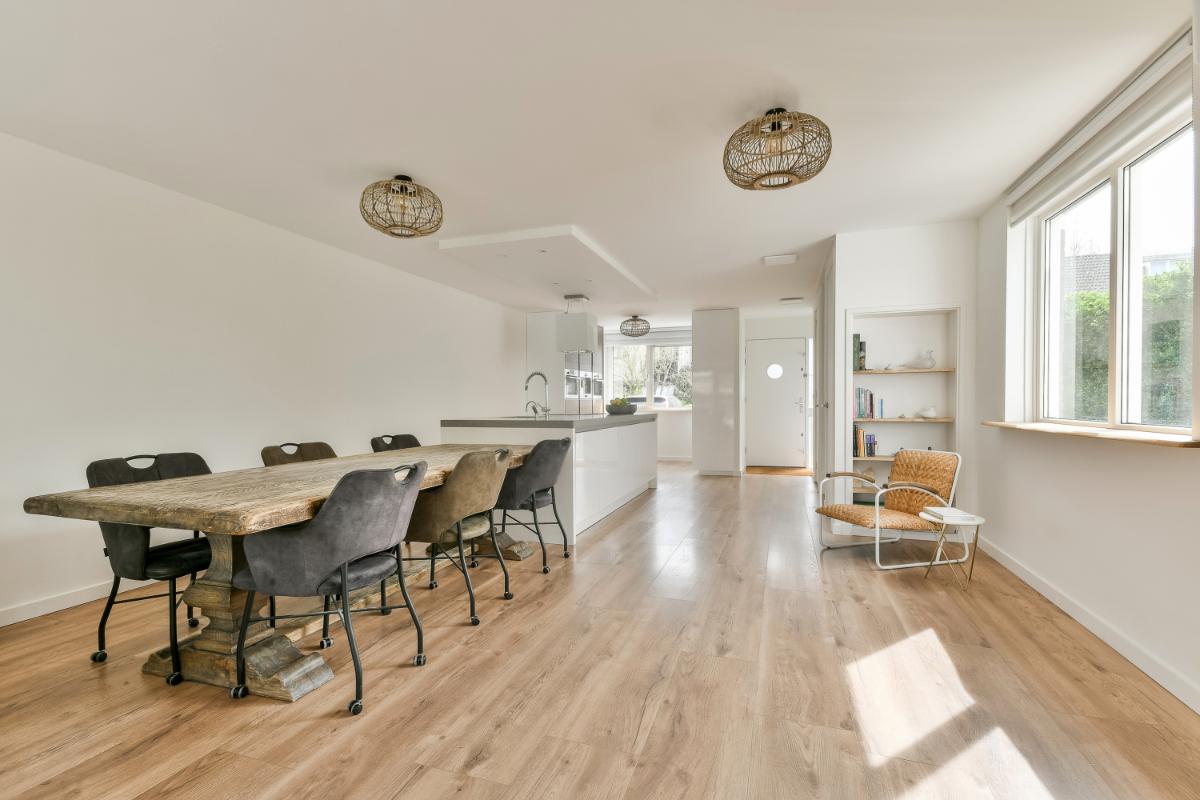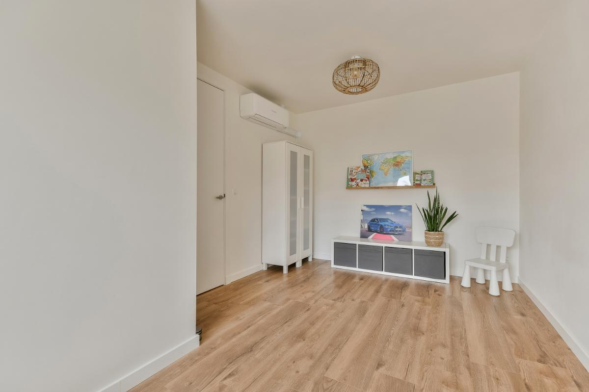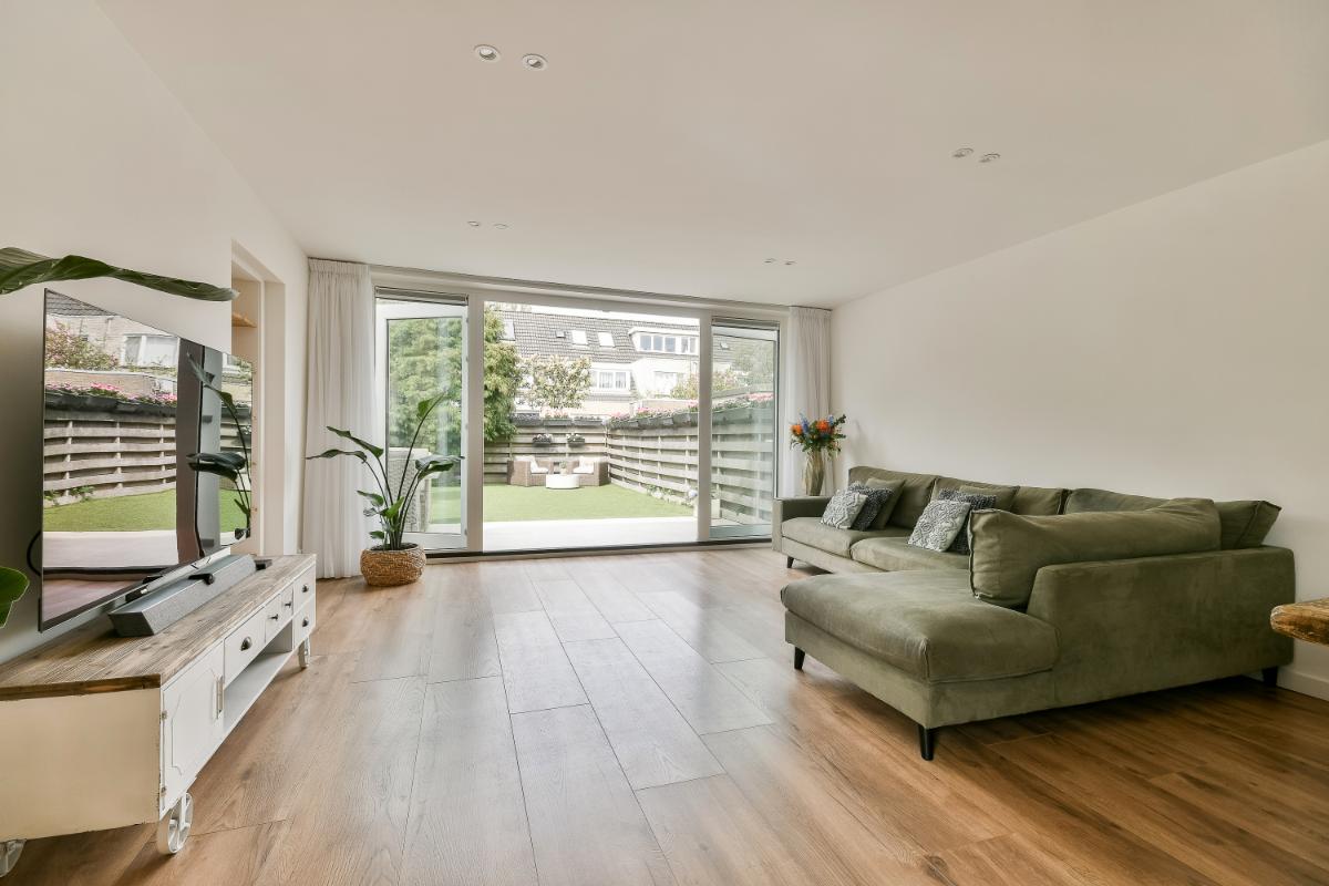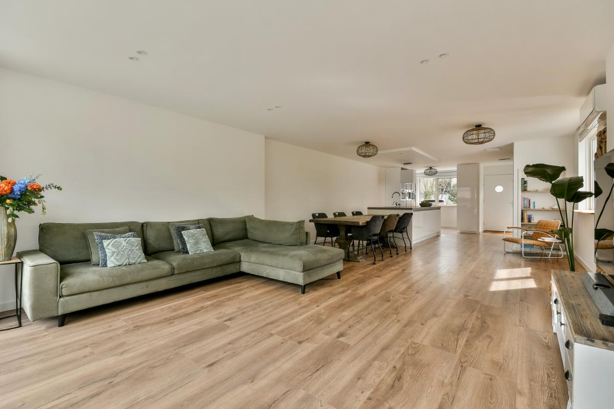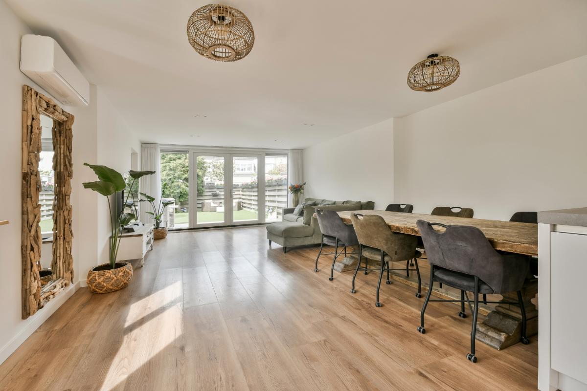 Layout: A lovely lounge area has been created in the front garden. Thanks to its southeast orientation, this is the perfect spot in the summer to enjoy breakfast in peace and quiet. Through the entrance hall, which includes a meter cupboard and toilet, you reach the living room with an open kitchen at the front. The extension at the rear and the redesign of the ground floor have created a spacious living area. The ground floor features underfloor heating, air conditioning, and is finished with beautiful laminate flooring with wide planks. Two large patio doors at the rear provide access to the large back garden, and a large window in the side wall ensures extra daylight in the center of the room.