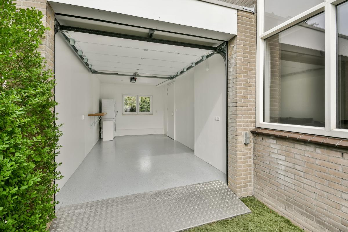De woonkamer heeft daarnaast via een bijzondere ‘boekenkast’deur direct toegang tot de naastgelegen multifunctionele ruimte (voormalige garage). Deze ruimte is afgewerkt met een gietvloer met vloerverwarming, geïsoleerde wanden en beschikt over groot kozijn in de achtergevel met uitzicht op de achtertuin. Dit is een ideale ruimte om bijvoorbeeld als werkkamer, speelkamer, logeerkamer of bijkeuken te gebruiken. Aan de voorzijde is er ook een (geïsoleerde) garagedeur, dus indien gewenst kan de ruimte ook nog steeds gebruikt worden om een auto, motor of fietsen te stallen.