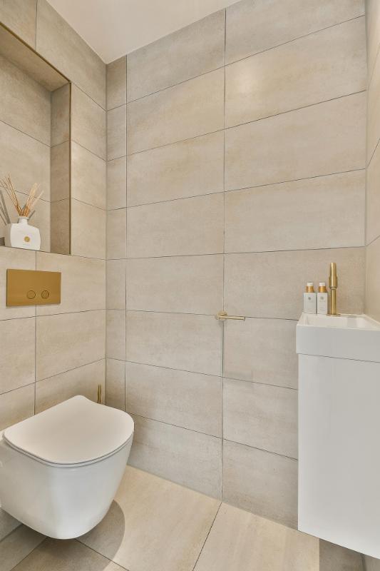 De in 2026 vernieuwde badkamer is afgewerkt in dezelfde stijl als de andere badkamer en voorzien van een inloopdouche, een wastafel met meubel en een wandcloset. In een vaste kast is de c.v.-installatie netjes en onzichtbaar weggewerkt.