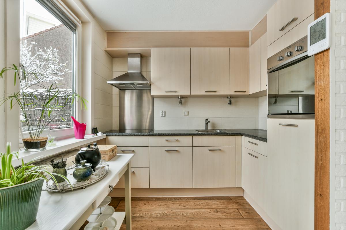 Indeling: Via de ruime entree met modern toilet, garderoberuimte en de trap naar de eerste verdieping is de woonkamer toegankelijk. De woonkamer beschikt over een mooie lamelparketvloer en een praktische trapkast. De kamer is ingedeeld met de zithoek aan de voorzijde en een eethoek met open keuken aan de achterzijde. De keuken is in een hoekopstelling geplaatst en biedt veel bergruimte in de onder- en bovenkasten. De keuken beschikt over verschillende inbouwapparatuur, zoals een koelkast, een oven, een inductiekookplaat en een afzuigkap.