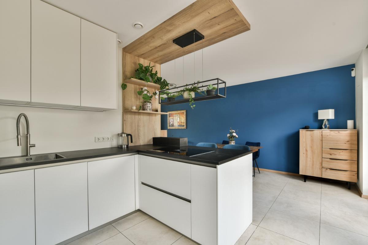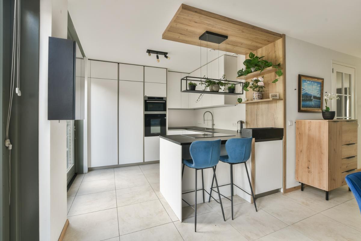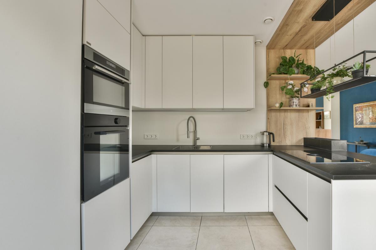 De open keuken is in 2024 volledig vernieuwd en is een echte eyecatcher. Het semi kookeiland met inductiekookplaat (Bora) en afzuiging biedt volop ruimte voor kookliefhebbers. Verder is de keuken uitgerust met een vaatwasmachine, een combimagnetron, een oven, een koelkast en vriezer, en heeft veel opbergmogelijkheden door de onder- en bovenkasten. De drie hoge kasten bieden extra ruimte, met de magnetron en oven op ooghoogte geplaatst. De lichte kleurstelling van de keuken in combinatie met het zwarte werkblad geeft het geheel een moderne en stijlvolle uitstraling.