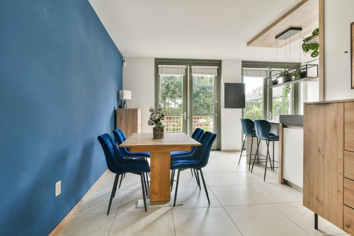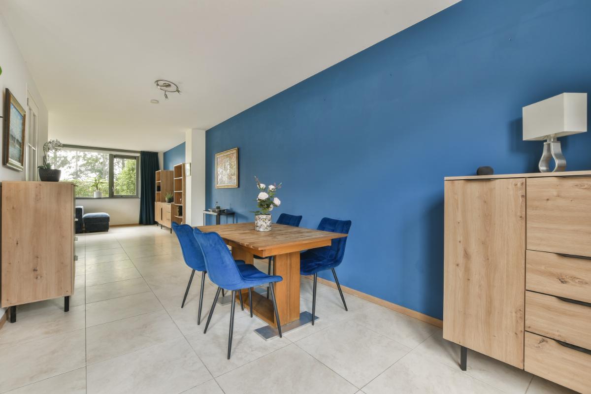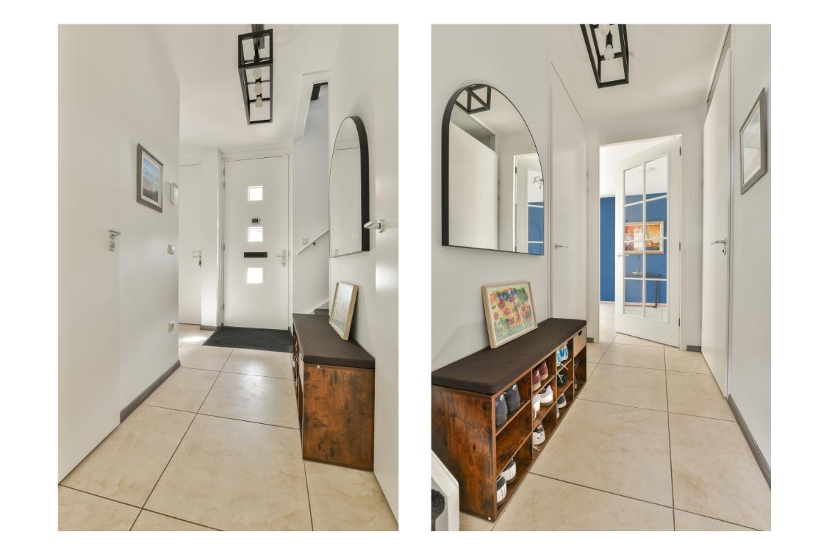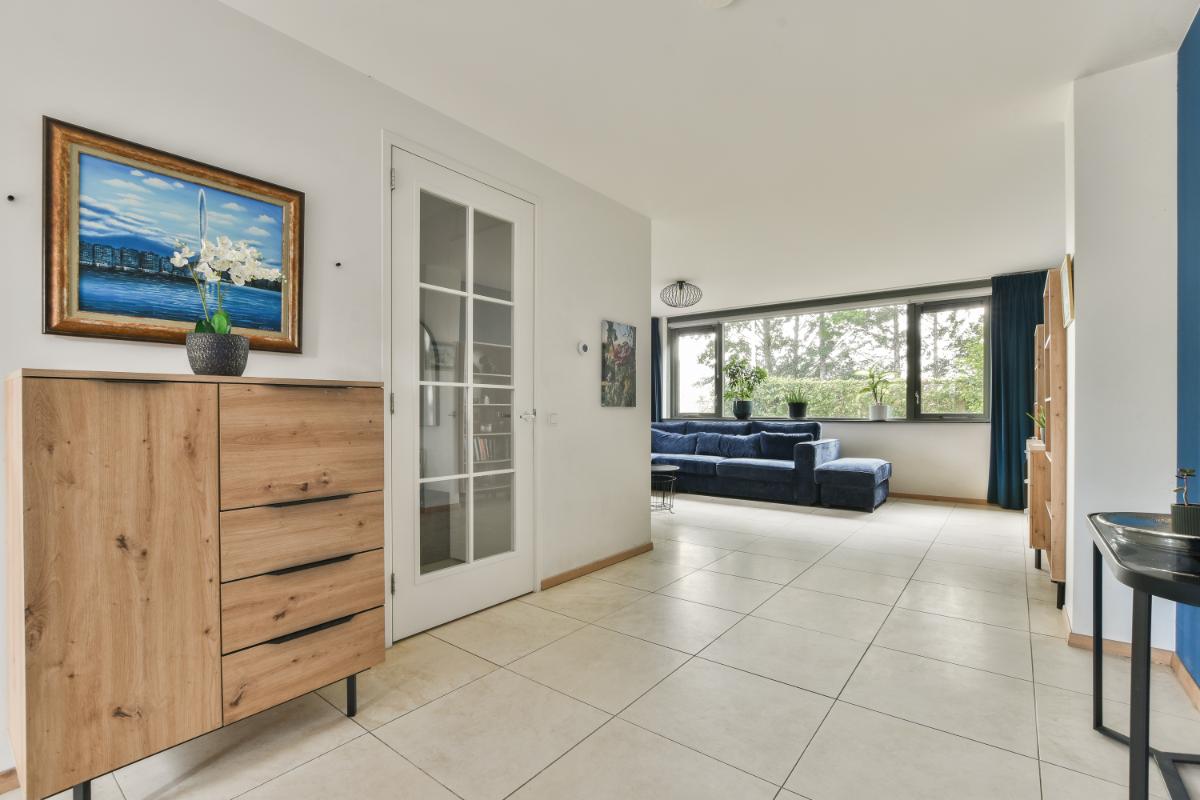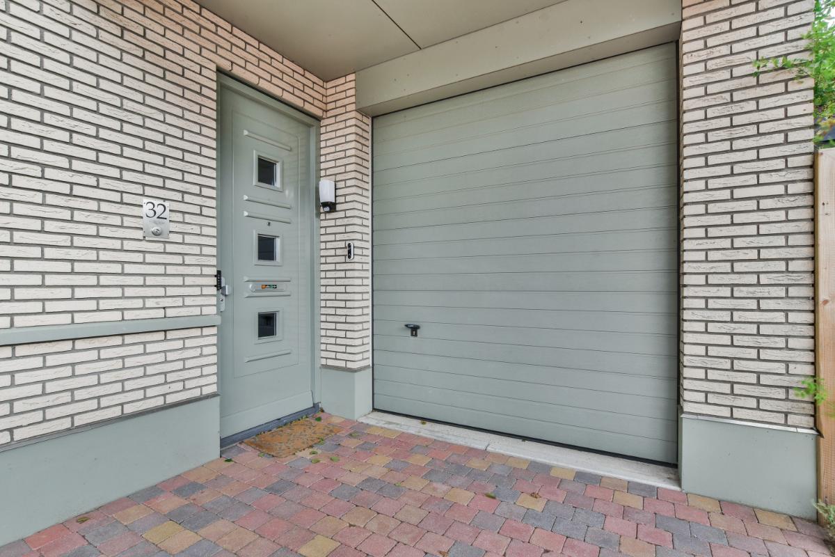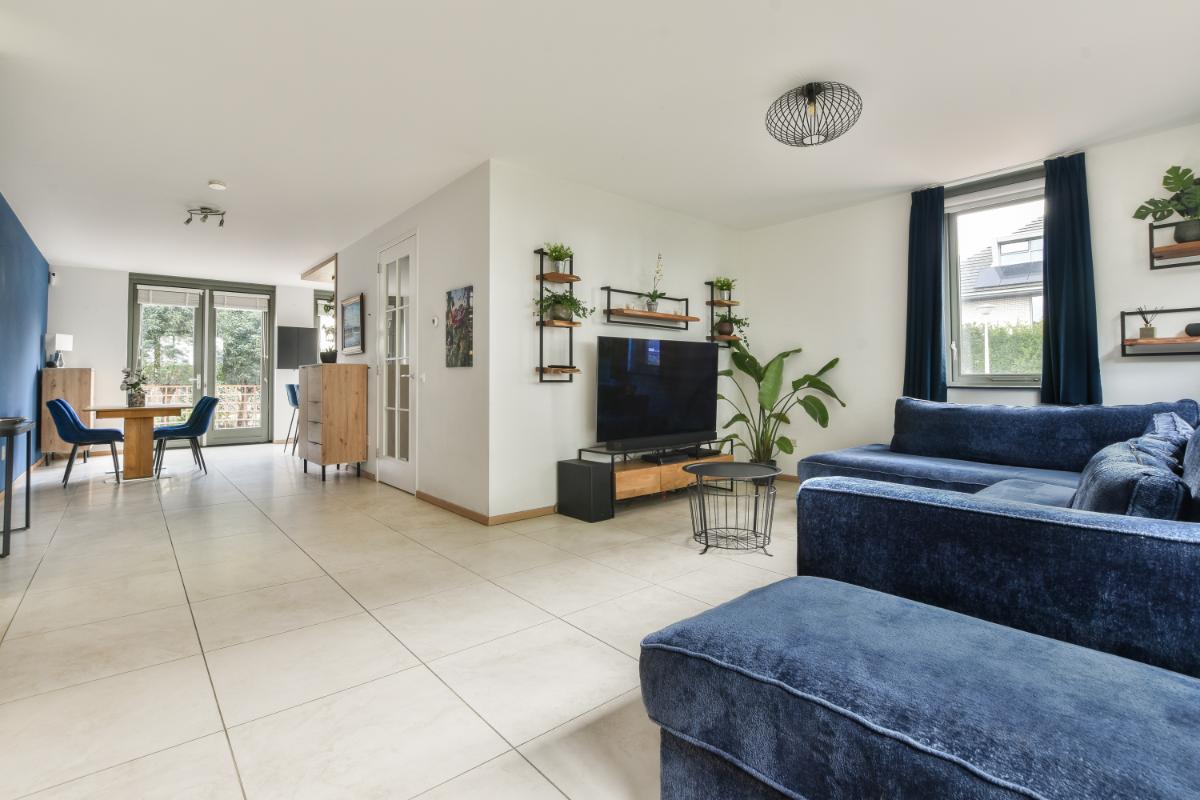 Layout: The house is accessible through the front garden, where the garage and storage room are also located. The spacious hallway provides access to the modern toilet, the garage, the meter cupboard, a practical under-stairs cupboard, and the stairs to the first floor. From the hallway, you enter the bright living room, which offers plenty of space for both a cozy lounge area and a spacious dining area. French doors open onto the back garden, adding even more light and space to the house. The living room features a light-colored tiled floor with underfloor heating.