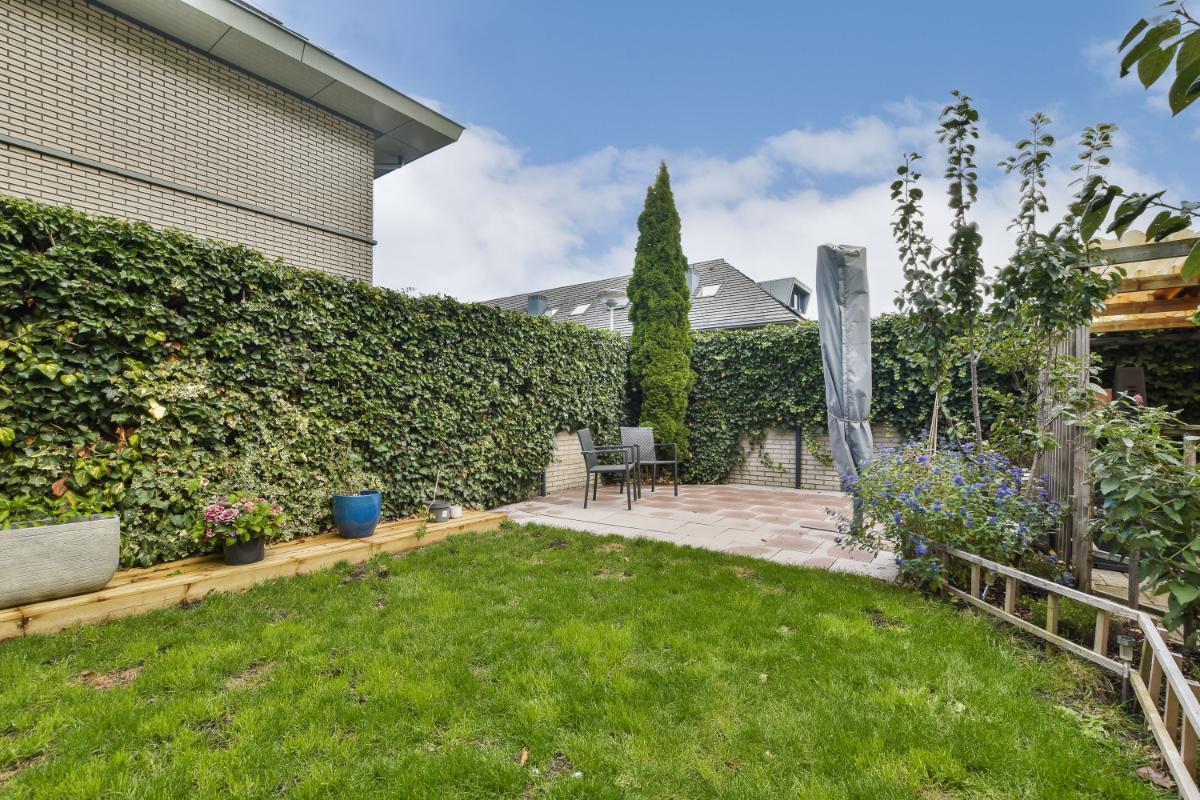 The Northeast-facing back garden is a wonderful place to relax, with a sun terrace, perennial borders, and grass. There is also a covered area near the storage room, and both the garage and the storage room are accessible from the garden.