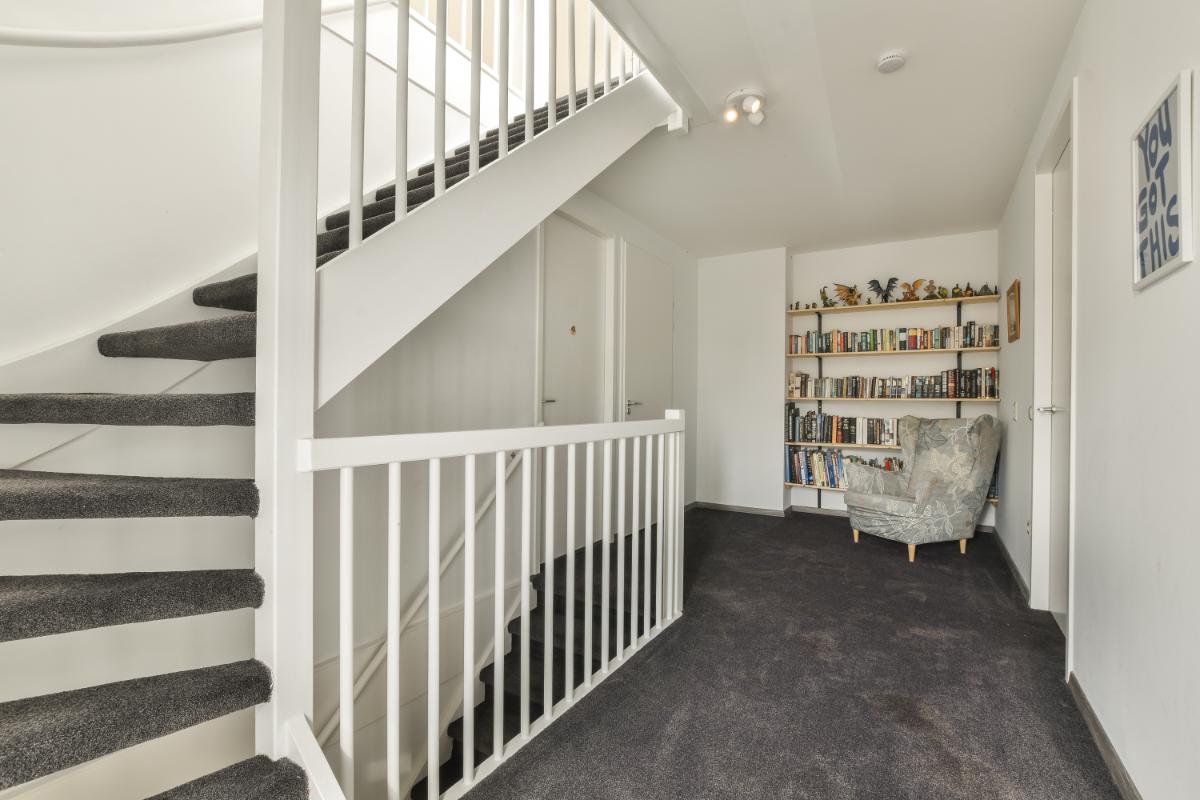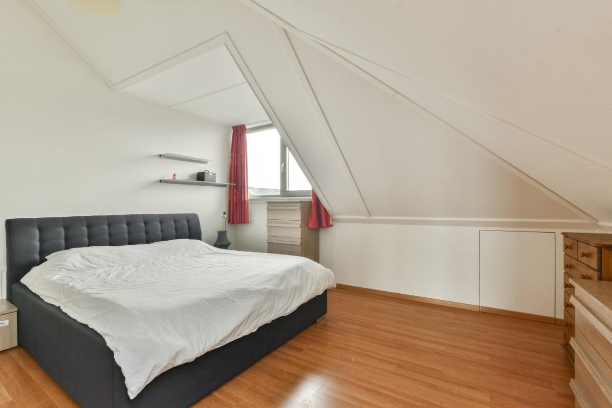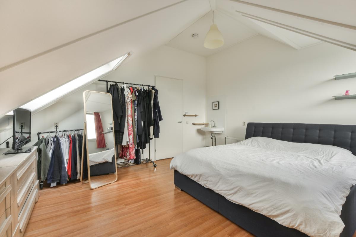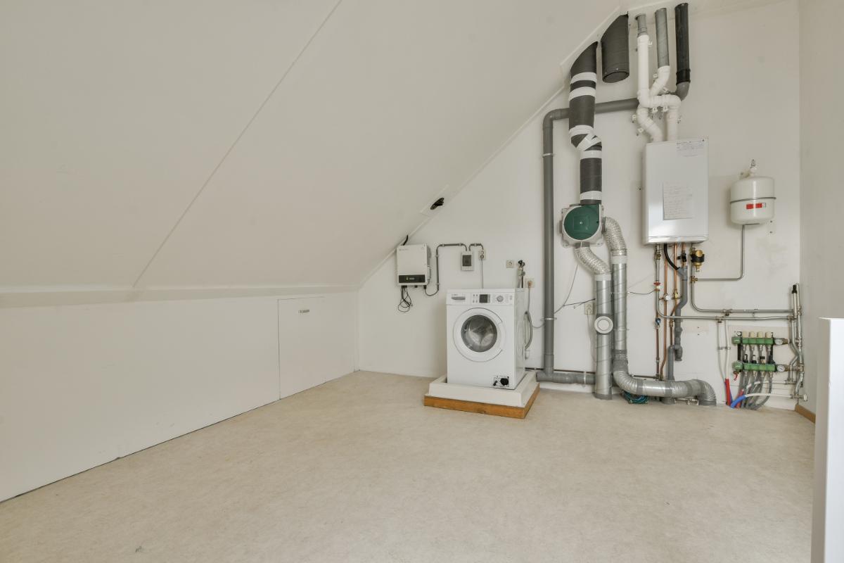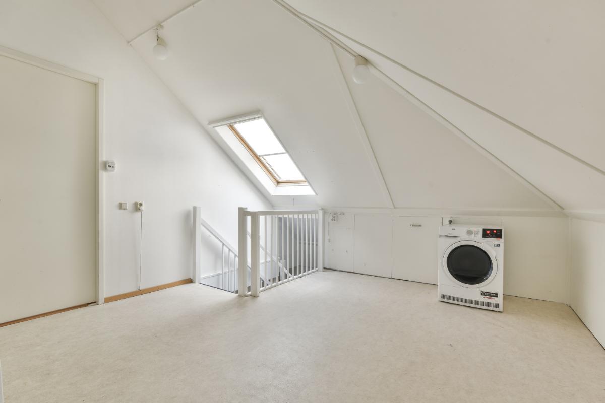 De tweede verdieping is bereikbaar via een vaste trap en biedt een ruime overloop met wasruimte, transformator voor de zonnepanelen, de cv-installatie en veel bergruimte. De grote slaapkamer heeft een dakkapel, waardoor deze extra ruimte en licht krijgt. De overloop heeft een groot dakraam en biedt volop mogelijkheden: door de grootte van de ruimte zou hier zelfs bijvoorbeeld een tweede slaapkamer of een tweede badkamer kunnen worden gerealiseerd.