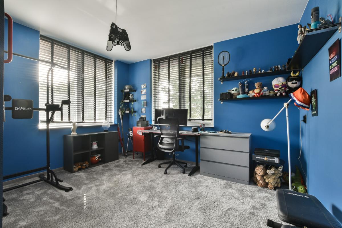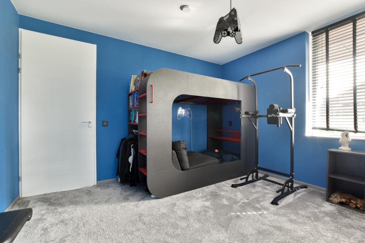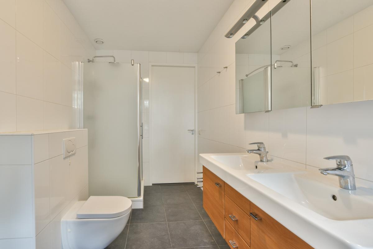Op de eerste verdieping bevindt zich een ruime overloop die toegang biedt tot drie royale slaapkamers en de moderne badkamer. Dankzij de hoekligging van de woning hebben zowel de slaapkamer aan de voorzijde als de slaapkamer aan de achterzijde extra ramen, wat zorgt voor meer lichtinval. De badkamer is volledig betegeld en biedt een heerlijk ligbad, een douchecabine, een modern wastafelmeubel met twee wastafels en een spiegel, een wandcloset en een designradiator. Ook is er een raam aanwezig voor natuurlijke ventilatie en daglicht.