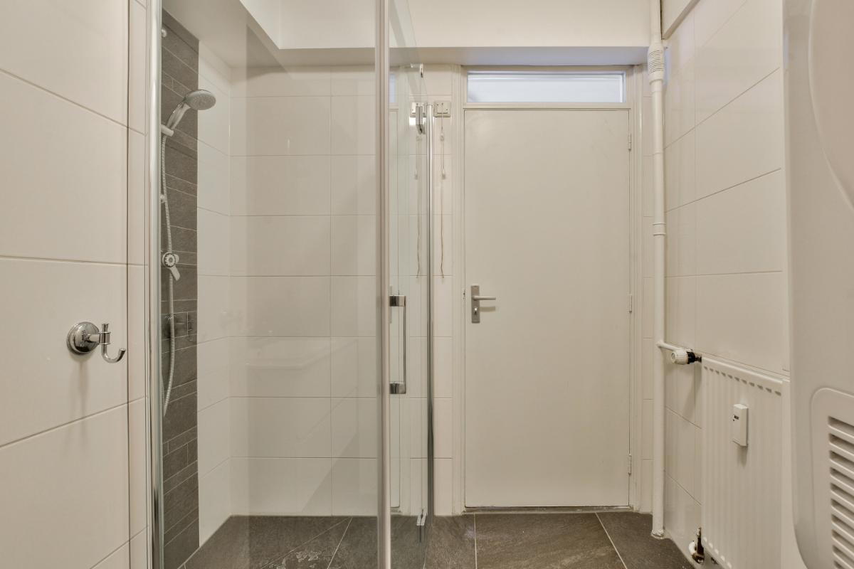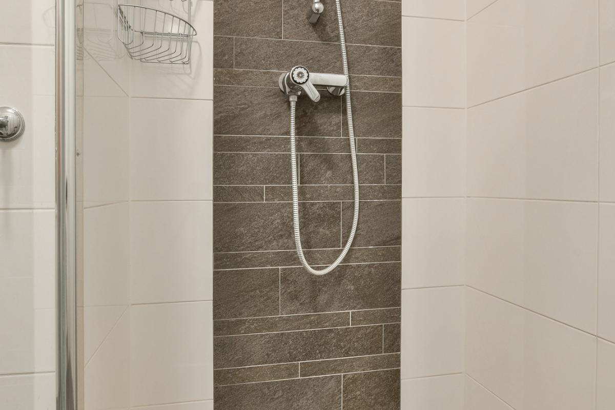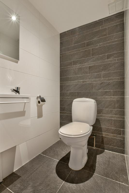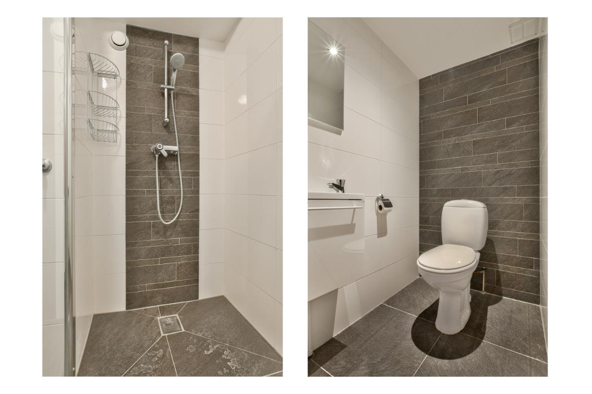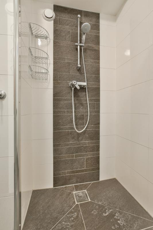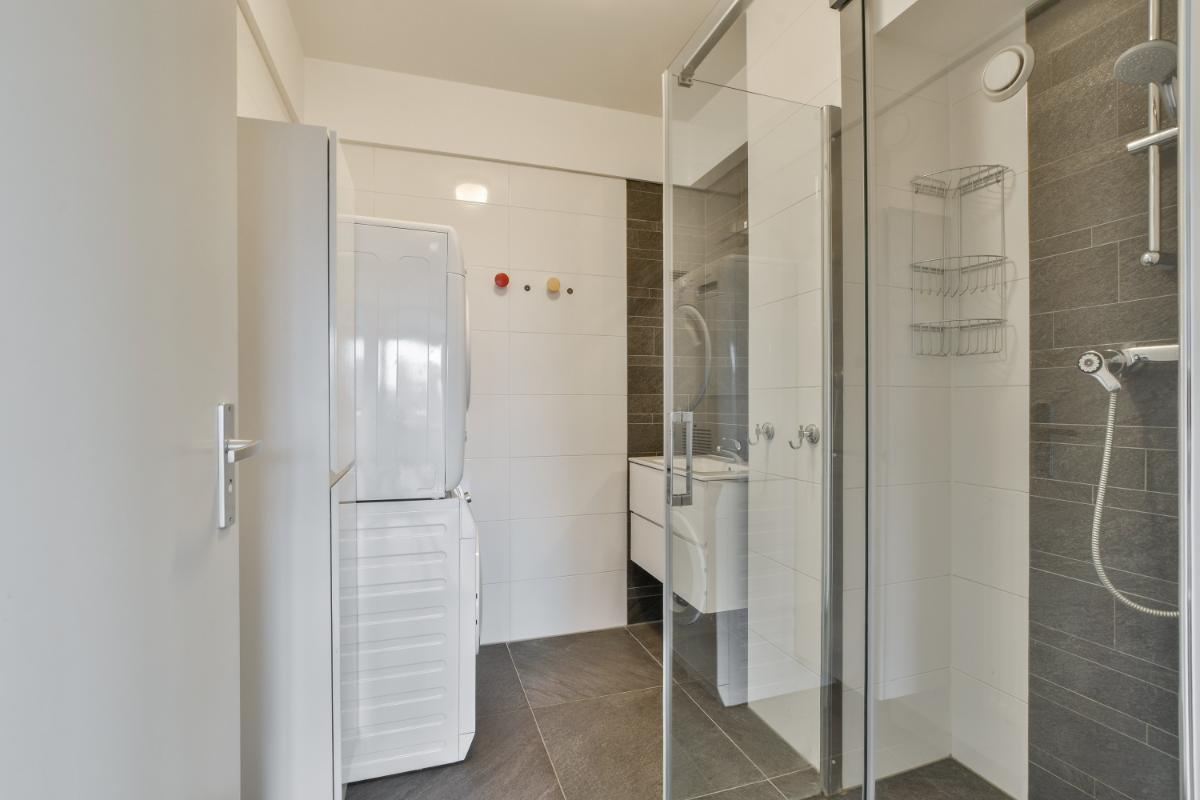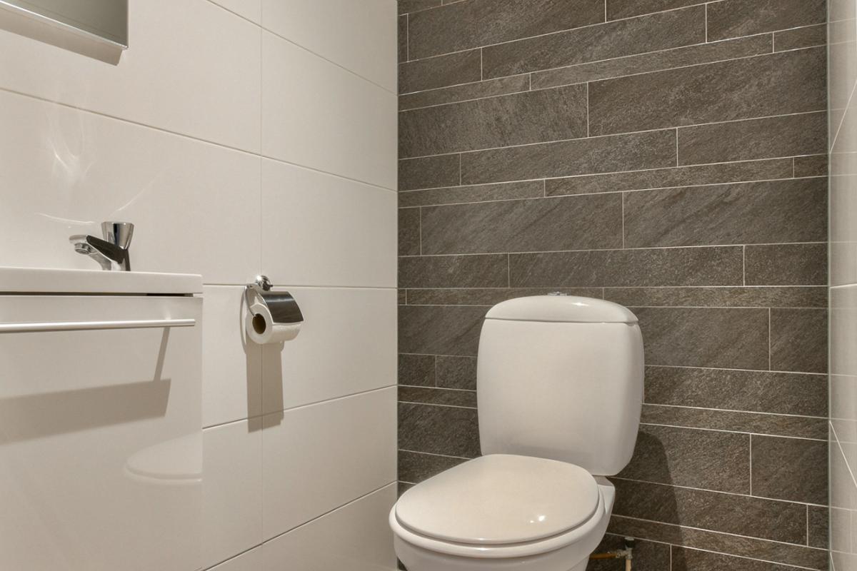 De badkamer is uitgevoerd met een moderne betegeling en ingedeeld met een inloopdouche met glazen spatscherm en een wastafelmeubel met moderne wastafel. Ook zijn hier de aansluitingen van de wasmachine en droger aanwezig. Naast de badkamer is er een vaste kast waar de elektrische boiler is geplaatst. Het separaat toilet is in dezelfde stijl uitgevoerd als de badkamer.