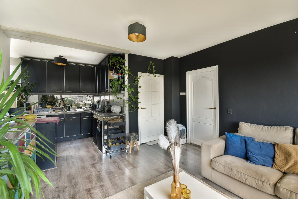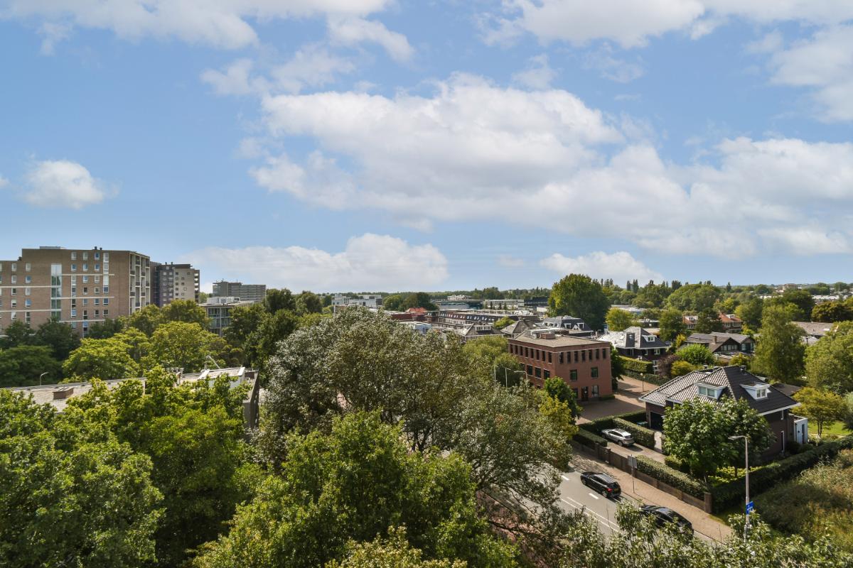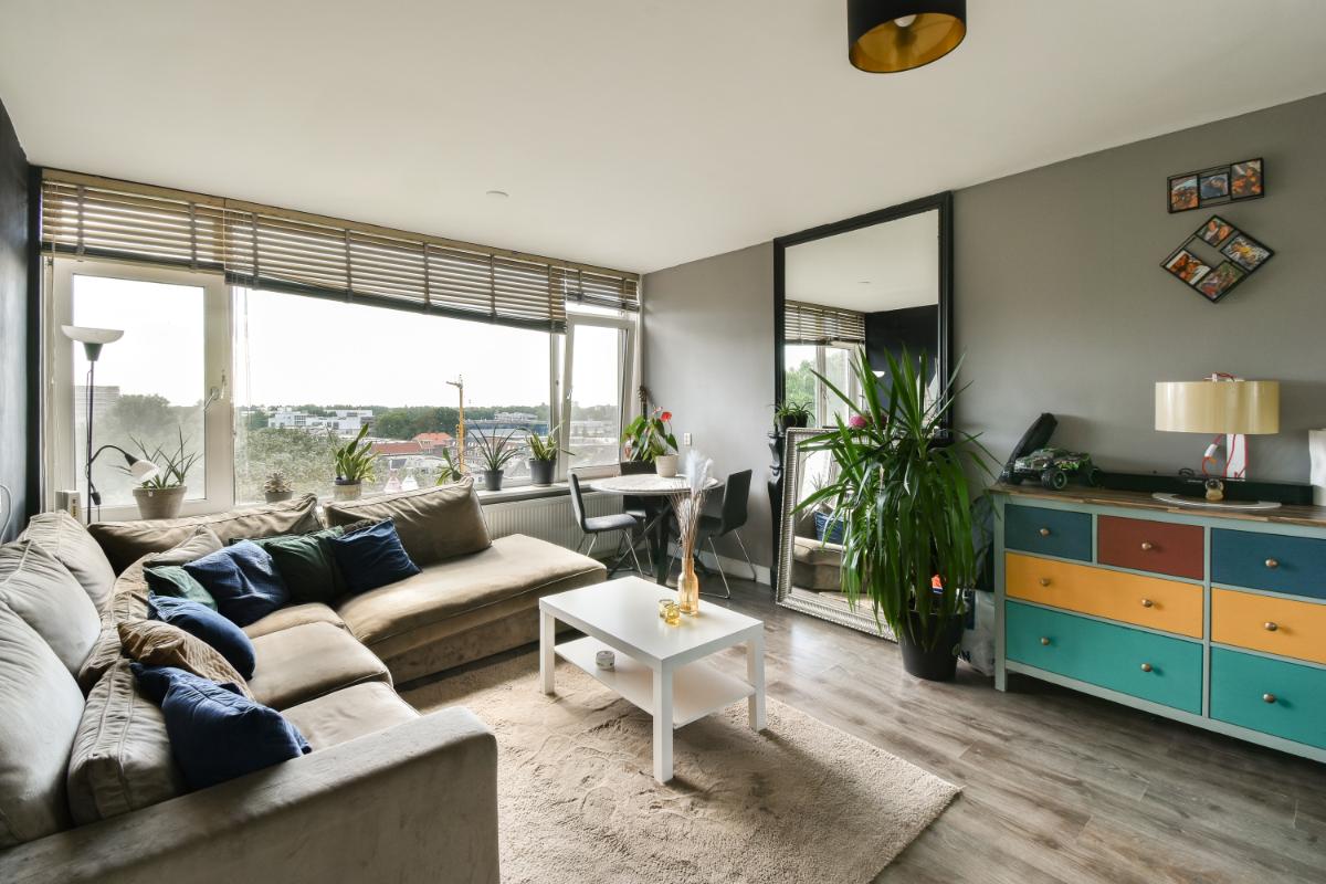 This two-room apartment is located on the 8th/top floor with fantastic views of the green surroundings and De Poel lake. The apartment has a south-facing balcony. The apartment is ideally situated in the wooded Keizer Karelpark residential area. For a walk in the woods, the nearby Amsterdamse Bos is just a few minutes away. In the immediate vicinity, you'll find Amstelveen's city center and the shops on Lindenlaan and Van der Hooplaan for your daily groceries. The Bovenkerk district, with its various restaurants, bars, and sports facilities, is also nearby. Public transport stops, including buses to Amstelveen bus station, Amsterdam, and Aalsmeer, are within walking distance, and major roads (including the A9, A2, and Beneluxbaan) are quickly and easily accessible. This is also a perfect location for people working at Schiphol Airport. For recreation along or on the water, De Poel lake is nearby. The apartment complex has a secure entrance with an intercom system and two elevators. The apartment has a separate storage unit in the basement, and free public parking is available in front of the building. Layout: The apartment complex has a secure entrance with two elevators. The apartment entrance provides access to a separate toilet, the boiler, and the living room with the open-plan kitchen. The living room is wonderfully bright thanks to the large south-facing windows and its corner location. From the living room, you have a view of the green surroundings and the small park adjacent to the building. The living room has laminate flooring. The compact kitchen is equipped with a gas cooktop with extractor hood and a double sink. The kitchen also has a washing machine connection. A side window provides additional natural light and offers a panoramic view of the Poel!