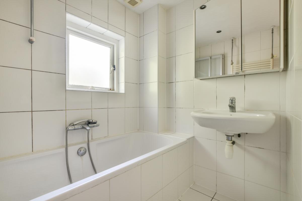 De badkamer is voorzien van witte betegeling, een ligbad met douchegelegenheid en spatscherm, een wastafel en een designradiator. Ook is er een raam aanwezig voor daglicht en natuurlijke ventilatie.