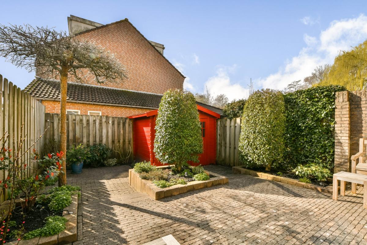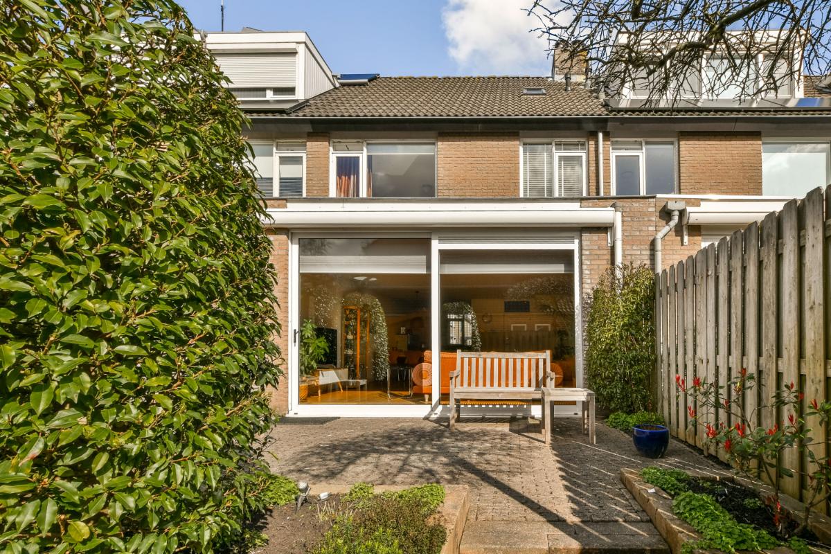 Via een grote schuifpui aan de achterzijde is de achtertuin te betreden welke op het zuiden is gelegen. De tuin biedt veel privacy en is speels en verzorgd (onder architectuur) aangelegd met bestrating en borders met vaste beplanting. Aan de achtergevel is over de gehele breedte van de woning een zonnescherm geplaatst.