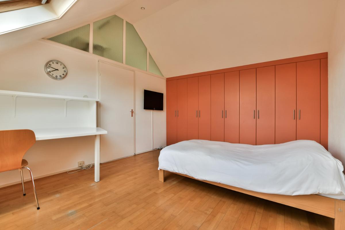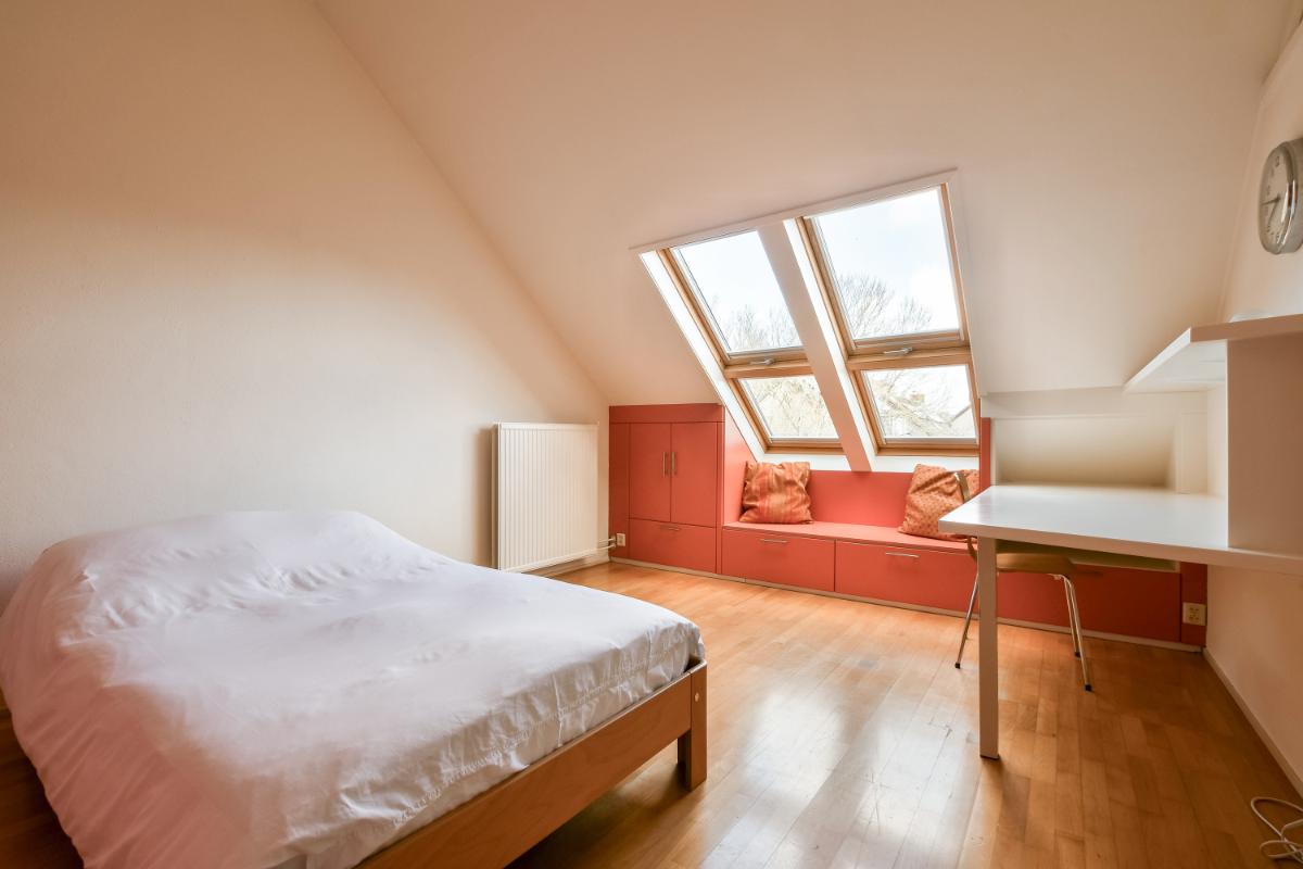 The second floor is accessible via a fixed staircase. This floor features a landing and a spacious bedroom with a high ceiling, double skylights at the front with a cozy seating area underneath, and a built-in wardrobe at the rear. There is space on the landing for the washing machine and dryer. The second floor can be enlarged by adding dormer windows to the front and rear, after which a two-bedroom layout is also possible.