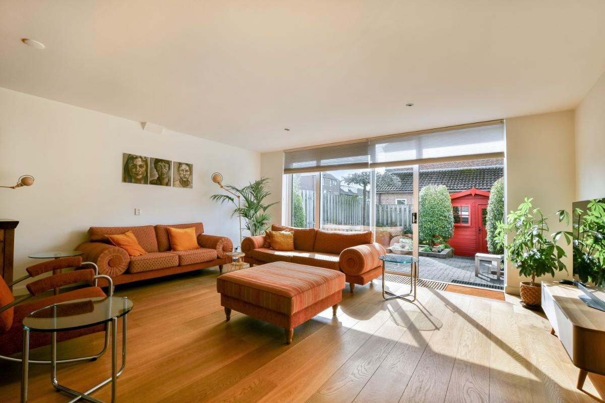 Layout: The house and the storage unit at the front are accessible from the front garden with parking space. The spacious hall provides access to the storage unit, the meter cupboard, the stairs, the modern toilet, and the spacious living room. The extended living room is wonderfully bright thanks to the large windows on the garden side and its south-facing location. The room offers enough space for a spacious seating and dining area. The hall, living room, and kitchen feature attractive wooden flooring.