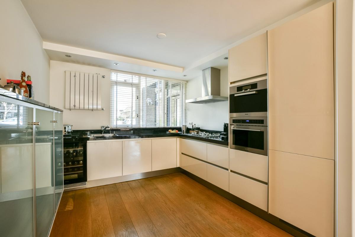 The modern open kitchen is located at the front of the house. The Siematic kitchen unit is arranged in a corner layout and features a stone worktop, ample cupboard space, a wine cooler, a dishwasher, a 5-burner hob (Smeg), a steam oven, a new combination microwave (Smeg), and a fridge-freezer. There is an unobstructed view of the street through a large window.