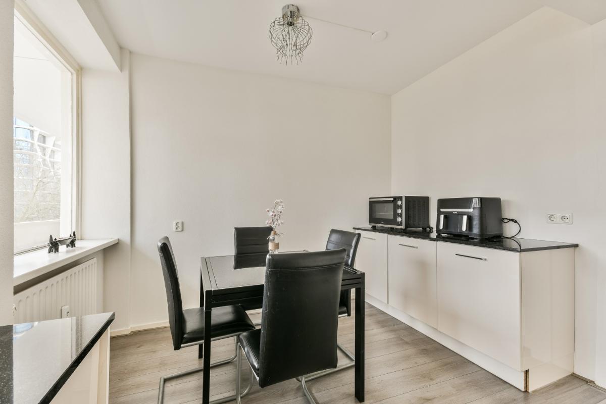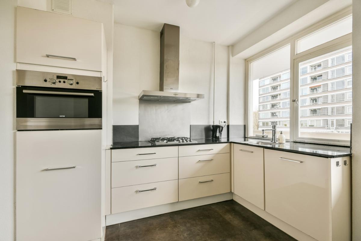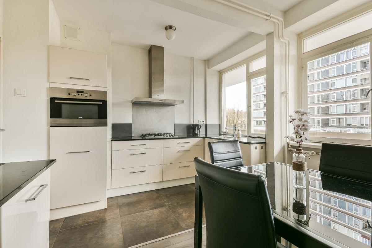 De dichte keuken ligt aan de galerijzijde en is heerlijk licht door de grote raampartijen. De keuken is vergroot door samenvoeging met een slaapkamer, waardoor een ruime, gezellige eetkeuken is ontstaan met ruimte voor een eettafel. Er is voldoende bergruimte aanwezig in de aanwezige kasten en lades en de moderne keuken is voorzien van een gaskookplaat, een afzuigkap (recirculatiekap), een koelkast, een combi-oven en een vaatwasmachine.