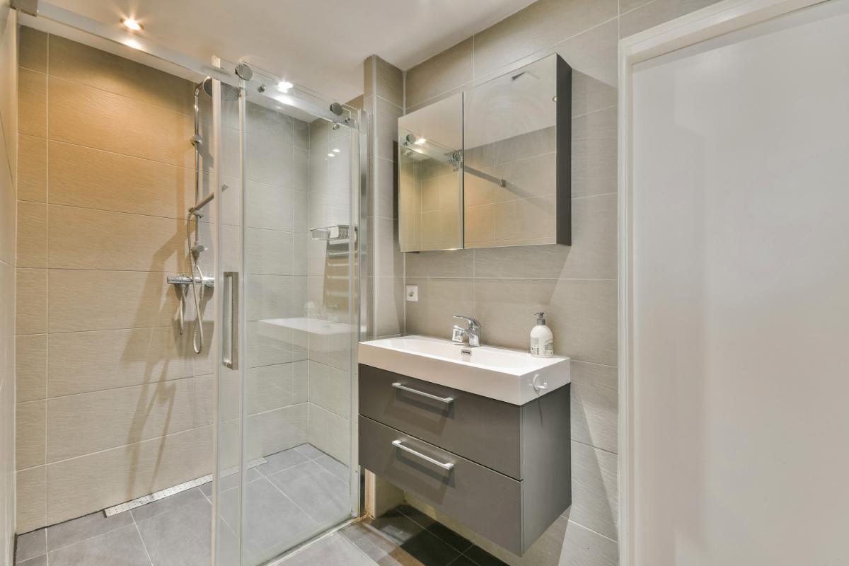 De badkamer is zowel vanuit deze slaapkamer als vanuit de hal bereikbaar. De moderne badkamer (2020) is volledig voorzien van betegeling. Er is een ruime inloopdouche, een modern wastafelmeubel en een designradiator aanwezig. Naast de badkamer is het separate toilet aanwezig. Aan de andere zijde van de badkamer is de inpandige berging aanwezig met de aansluitingen voor de wasmachine en de droger.