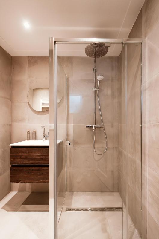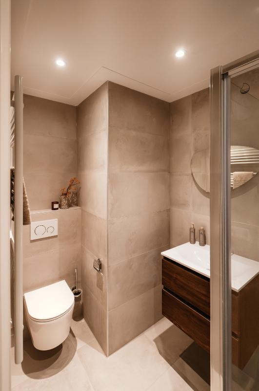 On the lower level are two comfortable bedrooms with natural daylight thanks to smart construction. The third bedroom, currently set up as a home office, is located on the ground floor. There are two luxurious bathrooms: one with a bathtub, walk-in shower, and double washbasin, and the other with a walk-in shower, double washbasin, and toilet. Additionally, there are two separate toilets (one on each floor) and a practical laundry area. Underfloor heating throughout and high-quality finishes ensure exceptional comfort.