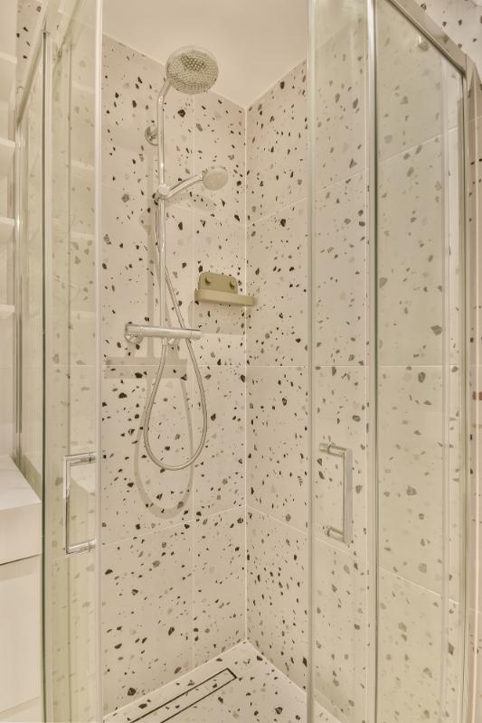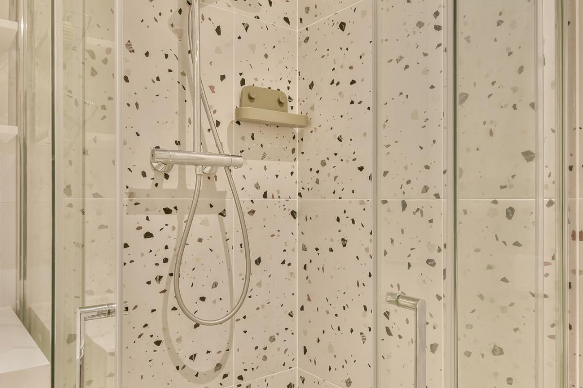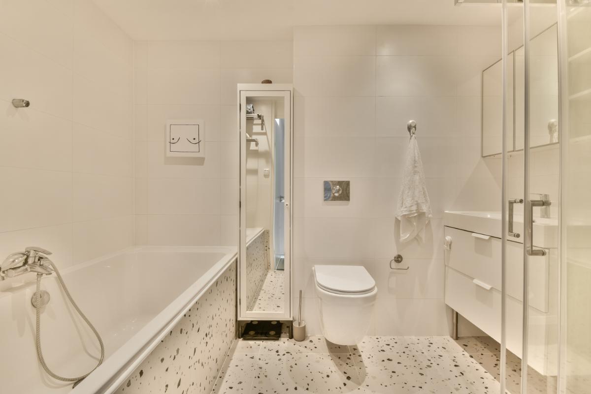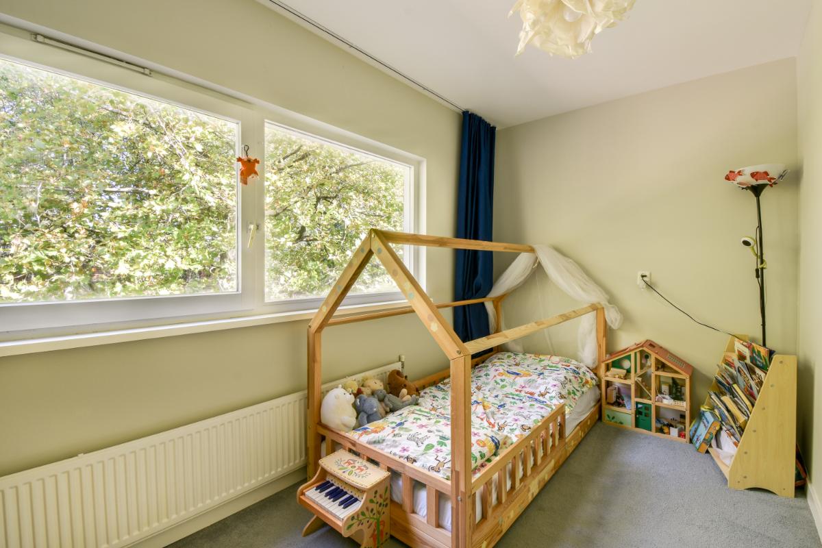 From the living room, a staircase leads to the second floor. This floor comprises a landing with a built-in wardrobe, two bedrooms, and a bathroom. The master bedroom is located at the rear of the house and therefore also offers a view of the garden and the water. The other bedroom is at the front of the house. Between these rooms is the modern bathroom, renovated in 2024 and equipped with a large bathtub, a separate shower, a vanity unit, and a wall-hung toilet. The landing has a built-in closet containing the central heating system and connections for the washing machine and dryer.