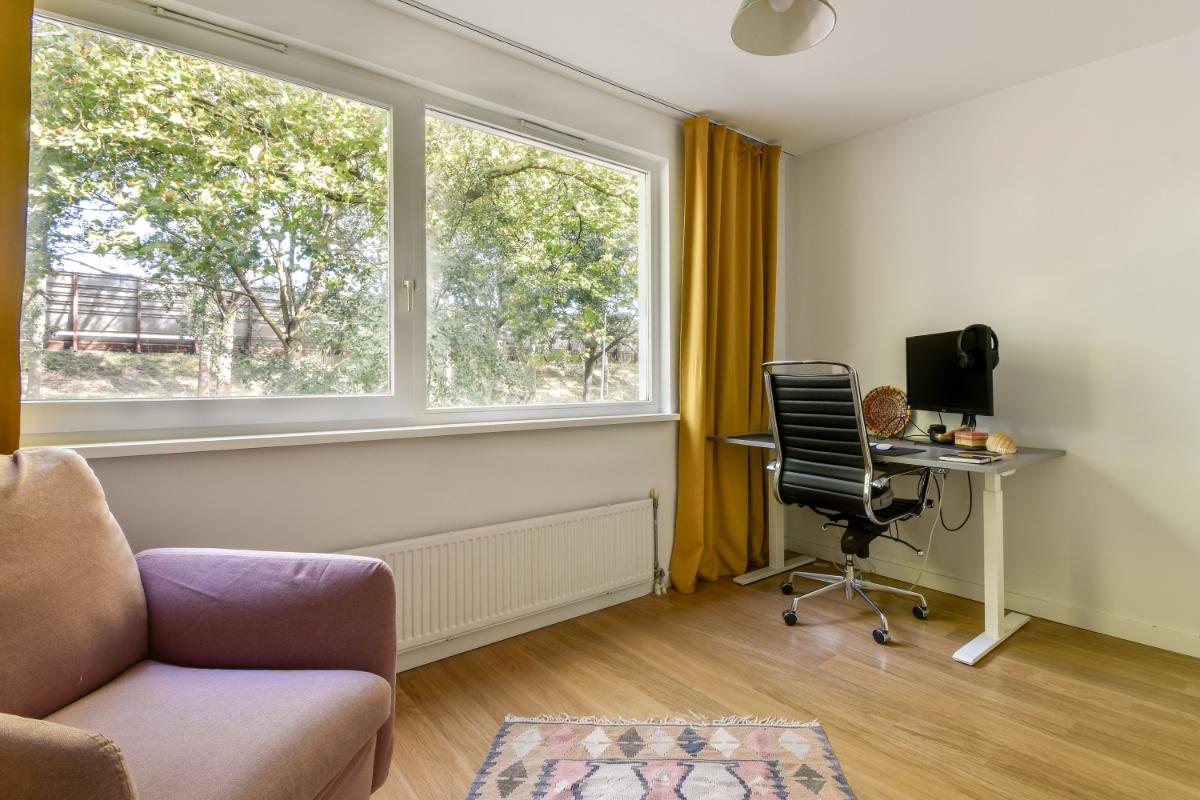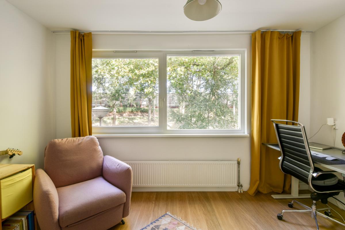 De eerste verdieping is ingedeeld met een woonkamer aan de achterzijde en een werk- of slaapkamer aan de voorzijde. De lichte woonkamer biedt net als de keuken een fraai en vrij uitzicht op zowel de tuin als het achtergelegen water. De kamer aan de voorzijde biedt vrij uitzicht op een groenstrook met bomen aan de overzijde van de straat.