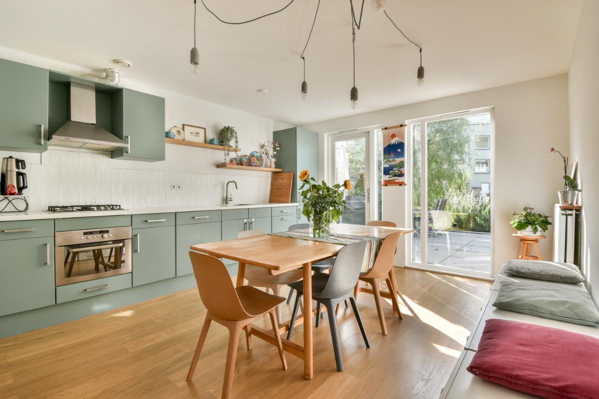 The kitchen features a modern unit that was upgraded a few years ago and includes a new countertop, a new sink, and various built-in appliances, including a hob, extractor hood, oven, dishwasher, and fridge/freezer. The kitchen area offers space for a large dining table and, like the rest of the house, is finished with beautiful laminate flooring and recently plastered walls. The stairs to the first floor are located in a corner.