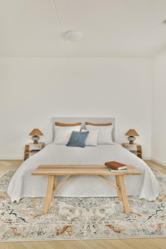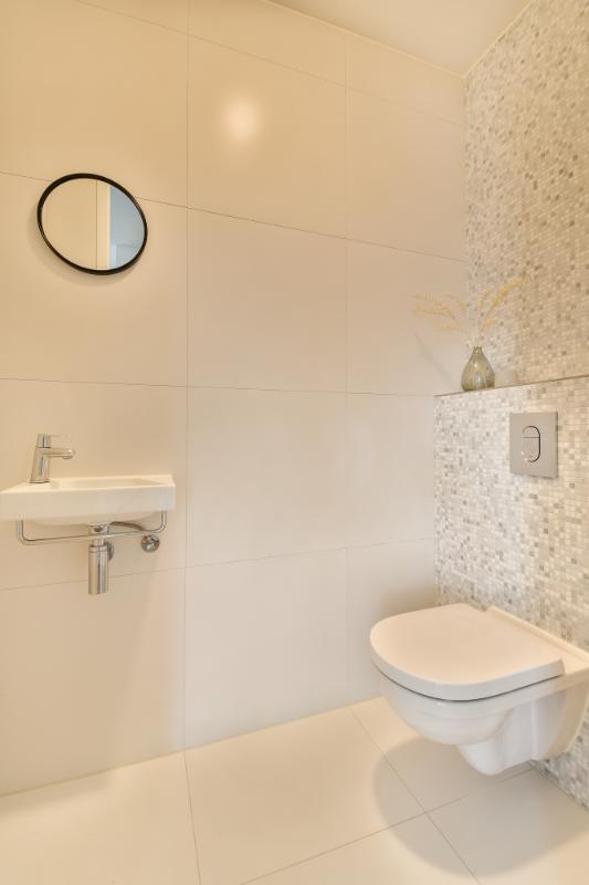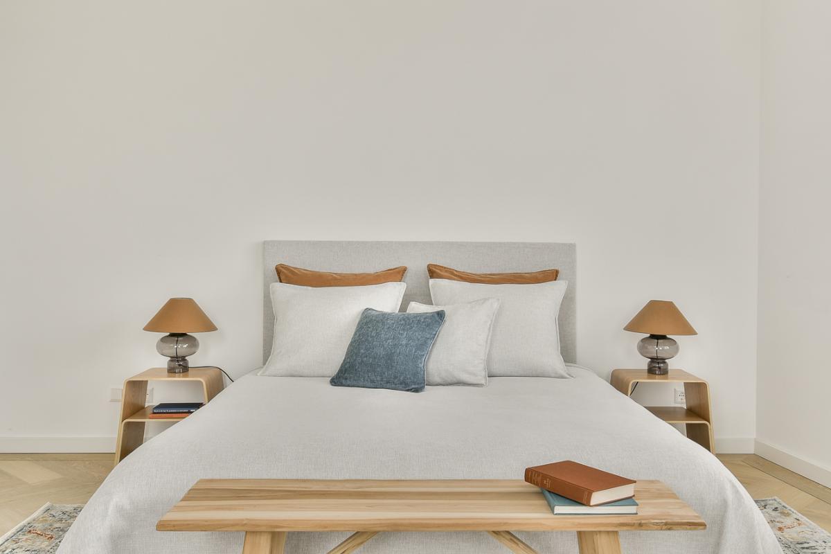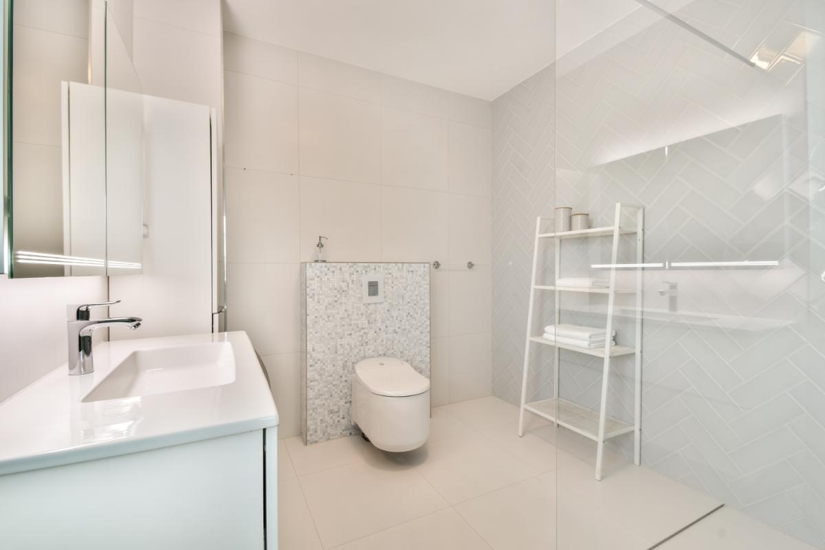 On the other side of the apartment are the two bedrooms, which, thanks to their corner location, are also wonderfully bright. Both rooms are spacious and have their own bathroom. The bedroom, adjacent to the living room, features a bathroom with underfloor heating, modern tiling, a Japanese toilet, a walk-in shower, and a modern vanity with a built-in light and sink. The fully tiled bathroom next to the second bedroom has underfloor heating, a wall-hung toilet, a walk-in shower, and a sink with vanity.