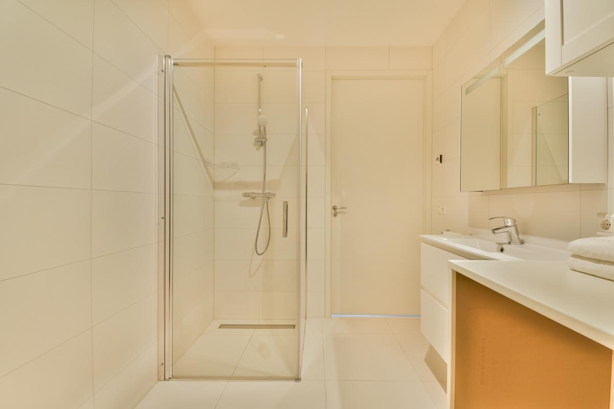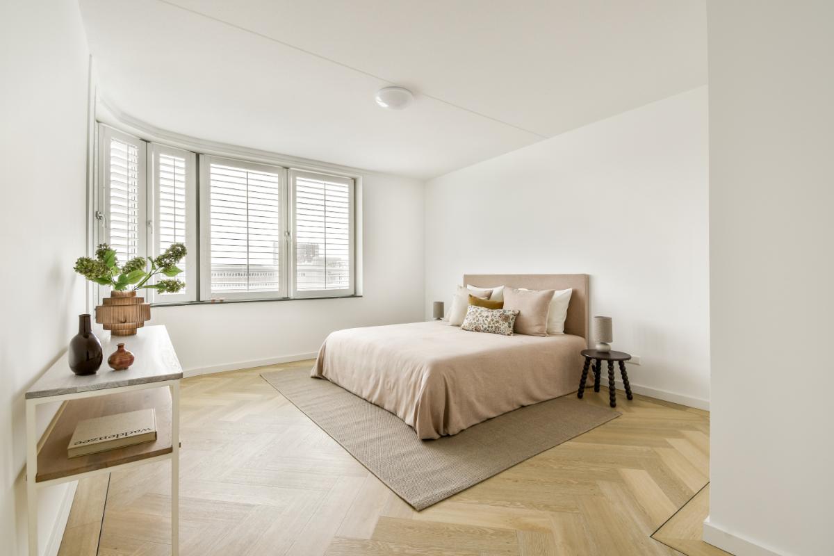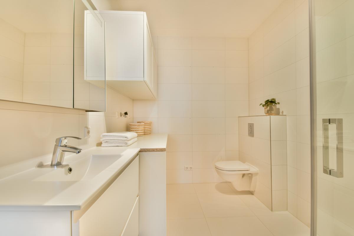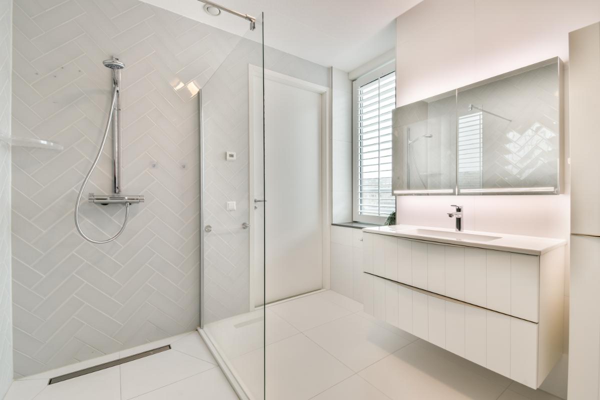 Aan de andere kant van het appartement bevinden zich de twee slaapkamers, die dankzij hun hoekligging eveneens heerlijk licht zijn. Beide kamers zijn ruim en beschikken over een eigen badkamer. De slaapkamer die aan de woonkamer grenst beschikt over een badkamer met vloerverwarming, moderne betegeling, een Japans toilet, een inloopdouche en een modern badkamermeubel met ingebouwd licht en wastafel. De geheel betegelde badkamer bij de tweede slaapkamer beschikt over vloerverwarming, een wandcloset, een inloopdouche en een wastafel met meubel. In een lage kast zijn de aansluitingen voor de wasmachine en de droger aanwezig waardoor deze keurig zijn weggewerkt en niet in het zicht zijn.
