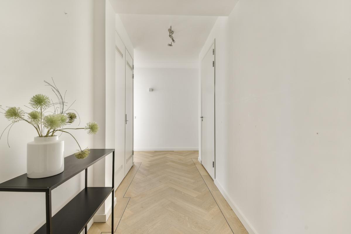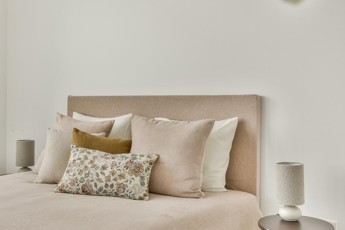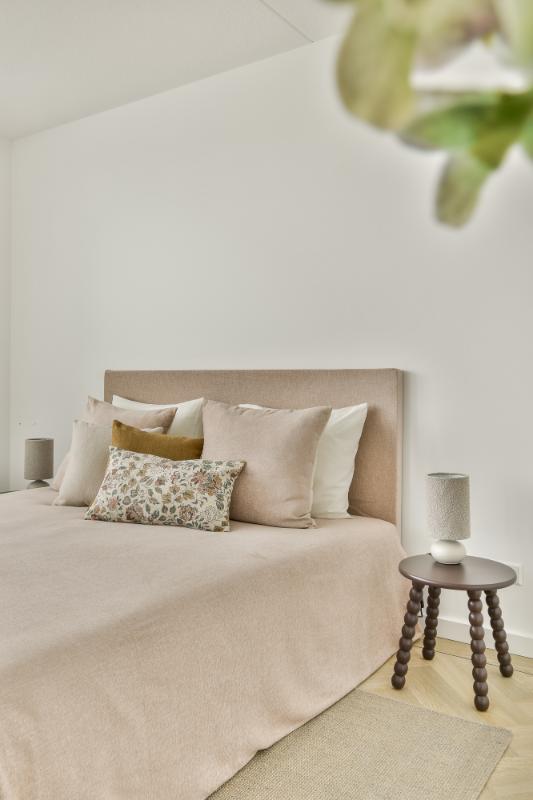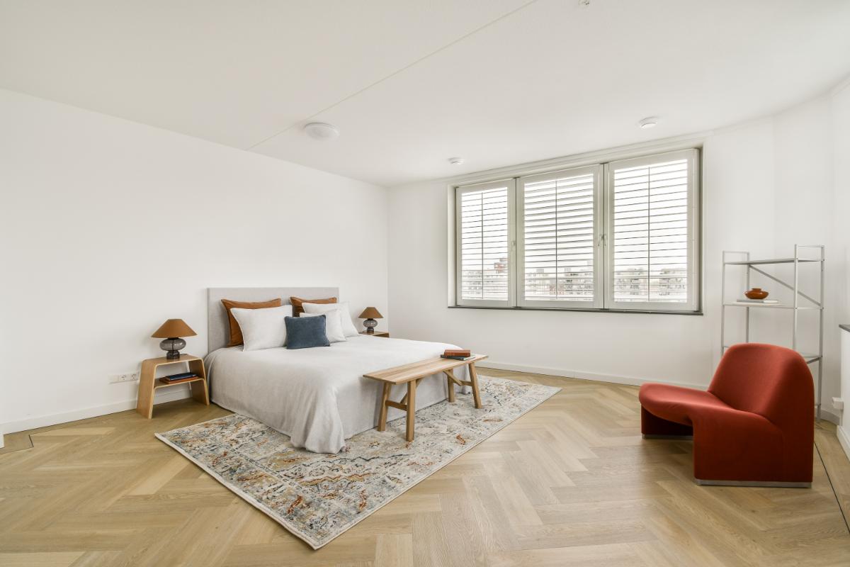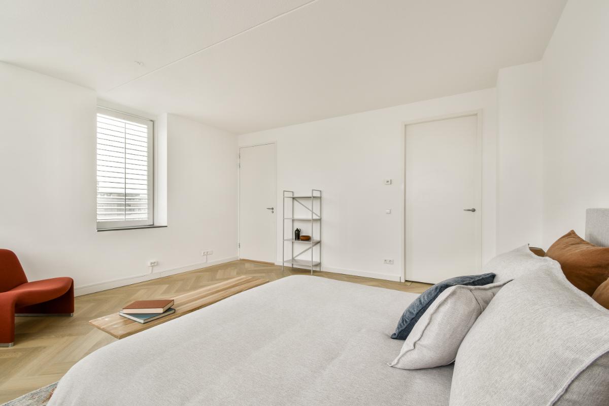 Aan de andere kant van het appartement bevinden zich de twee slaapkamers, die dankzij hun hoekligging eveneens heerlijk licht zijn. Beide kamers zijn ruim en beschikken over een eigen badkamer. De slaapkamer die aan de woonkamer grenst beschikt over een badkamer met vloerverwarming, moderne betegeling, een Japans toilet, een inloopdouche en een modern badkamermeubel met ingebouwd licht en wastafel. De geheel betegelde badkamer bij de tweede slaapkamer beschikt over vloerverwarming, een wandcloset, een inloopdouche en een wastafel met meubel. In een lage kast zijn de aansluitingen voor de wasmachine en de droger aanwezig waardoor deze keurig zijn weggewerkt en niet in het zicht zijn.