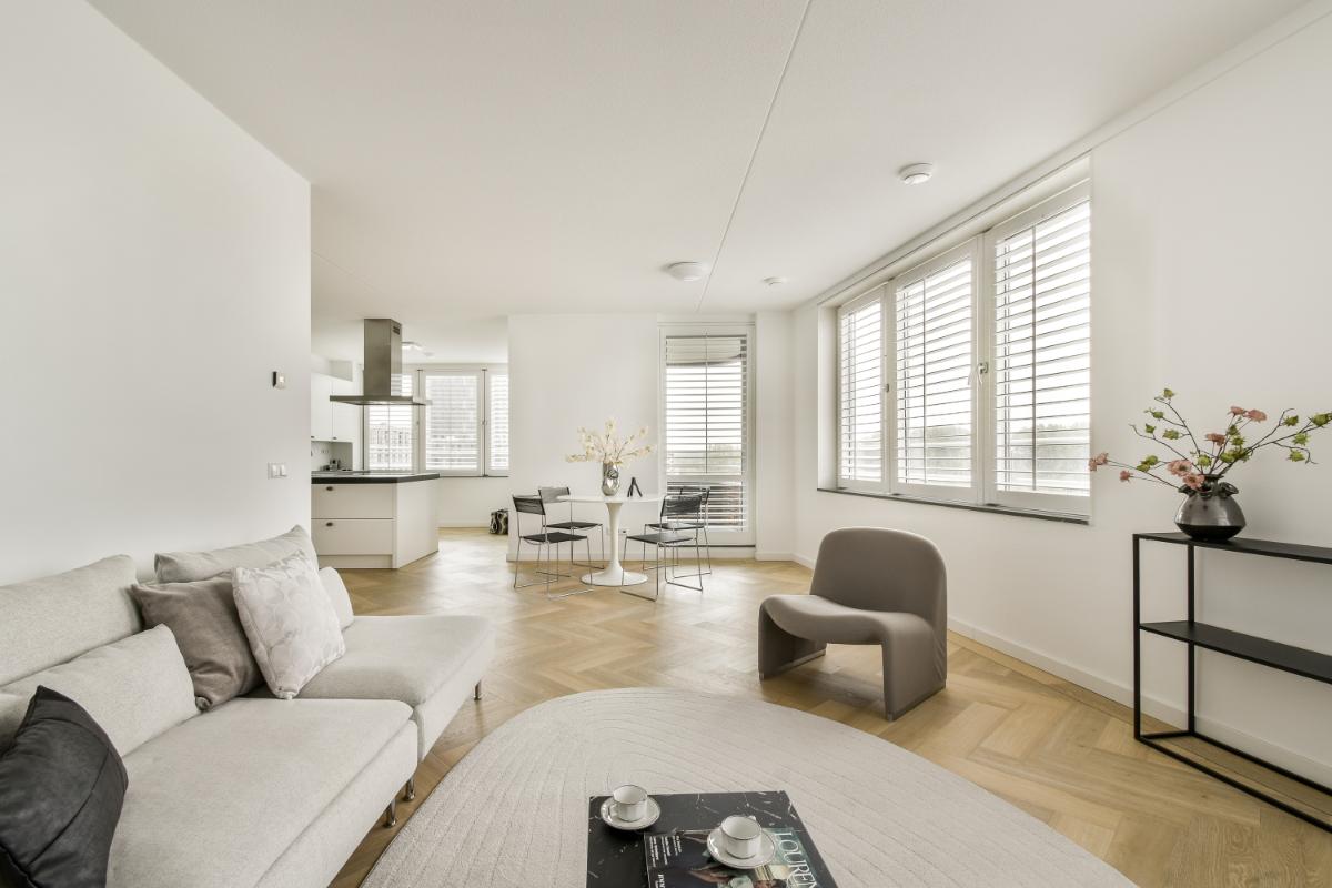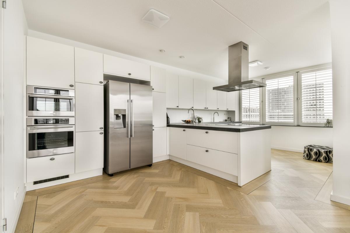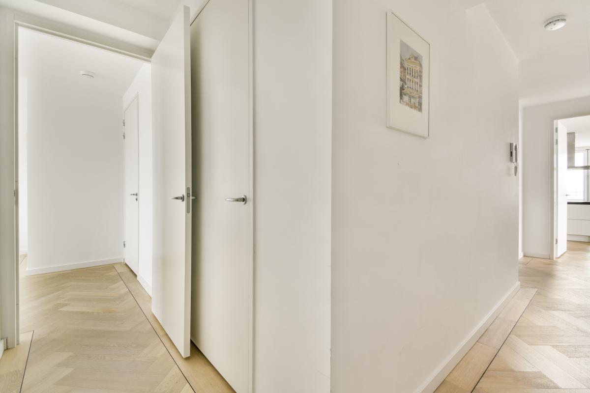 Indeling: Via de gemeenschappelijke entree met brievenbussen, het trappenhuis en twee liften, bereik je de woning op de zevende verdieping. De eerste kennismaking met het appartement is de prachtige pvc-visgraatvloer die de hele woning verbindt. De ruime hal biedt een garderobekast en een separaat toilet met fonteintje. De hal geeft toegang tot alle vertrekken. Zodra je de woonkamer betreedt, word je omarmd door het daglicht dat dankzij de hoekligging van twee zijden binnenkomt. De prachtige houten shutters geven een sfeervolle lichtinval. De royale kamer biedt volop ruimte voor een comfortabele zit- en eethoek. Het terras op het westen is een verlengstuk van de woonkamer. De moderne, luxe open keuken met semi kookeiland maakt het plaatje compleet en is een droom voor iedere kookliefhebber. De keuken is voorzien van voldoende werk- en opbergruimte, alle nodige inbouwapparatuur van hoogwaardige kwaliteit zoals een Quooker (heet, koud, bruisend), een inductie kookplaat met afzuigkap, een Amerikaanse koelkast, 2 koellades, een Engelse vaatwasmachine (2 delen), een ingebouwde combimagnetron en een oven.