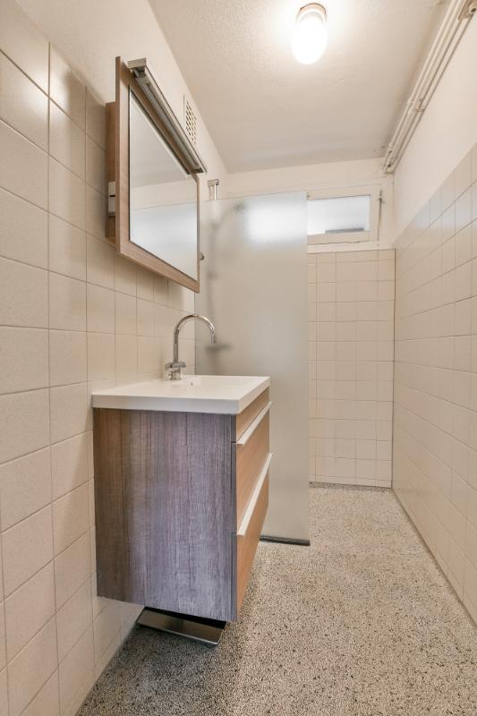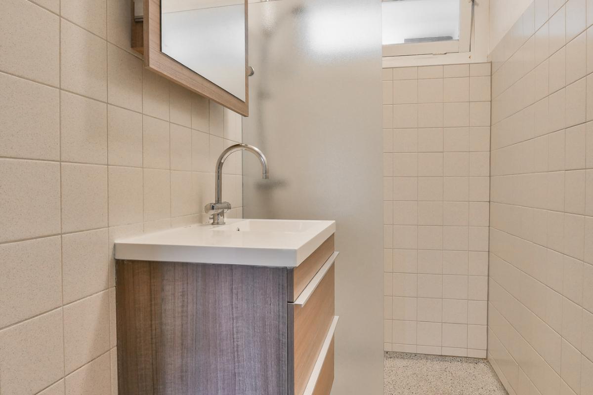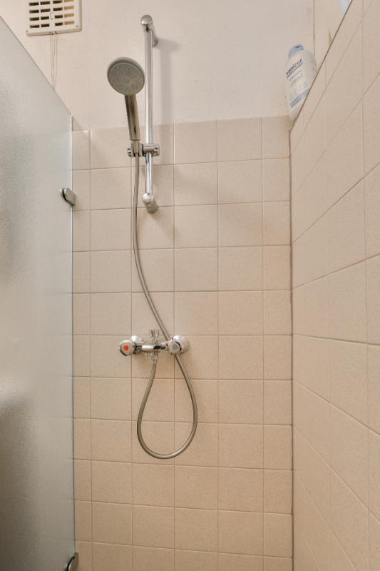 Naast de keuken is er toegang tot het separaat toilet en daarnaast vindt u de compacte badkamer voorzien van een inloopdouche en een wastafel met badkamermeubel en spiegel. De badkamer is afgewerkt met een mooie lichte tegel en een granitovloer. Ook is hier een raam aanwezig voor daglicht en natuurlijke ventilatie.