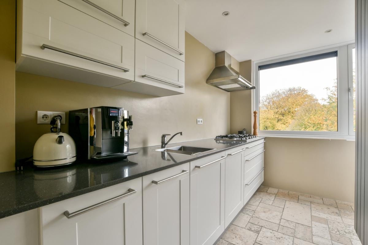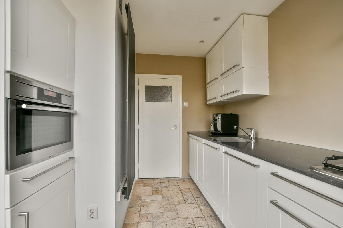 De keuken beschikt over een groot raam en is ingedeeld met een keukenblok met lades en onderkasten, een gedeelte bovenkasten, een 5 pits-gaskookplaat, een afzuigkap, een vaatwasmachine en in een hoge kast is de combi-oven op ooghoogte ingebouwd. In een nis is er ruimte voor een grote niet ingebouwde koelkast. De keuken is afgewerkt met een werkblad van composiet en de vloer met een onderhoudsvriendelijke tegel.