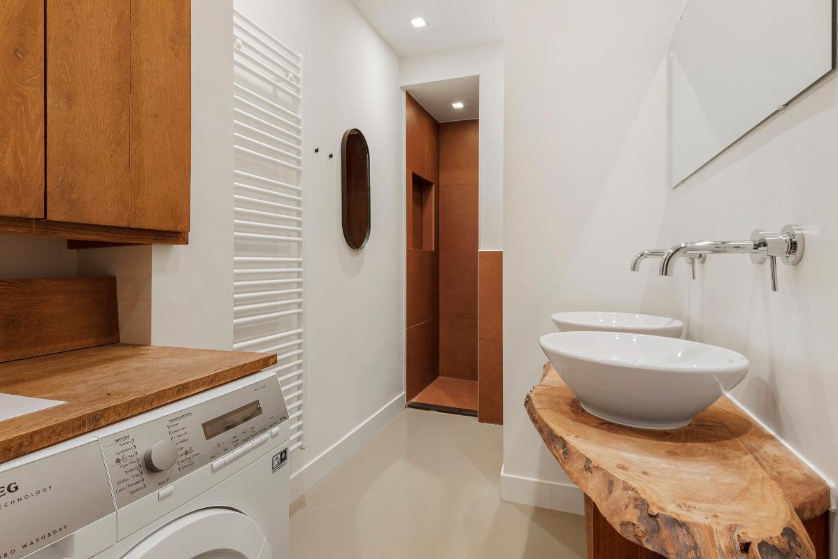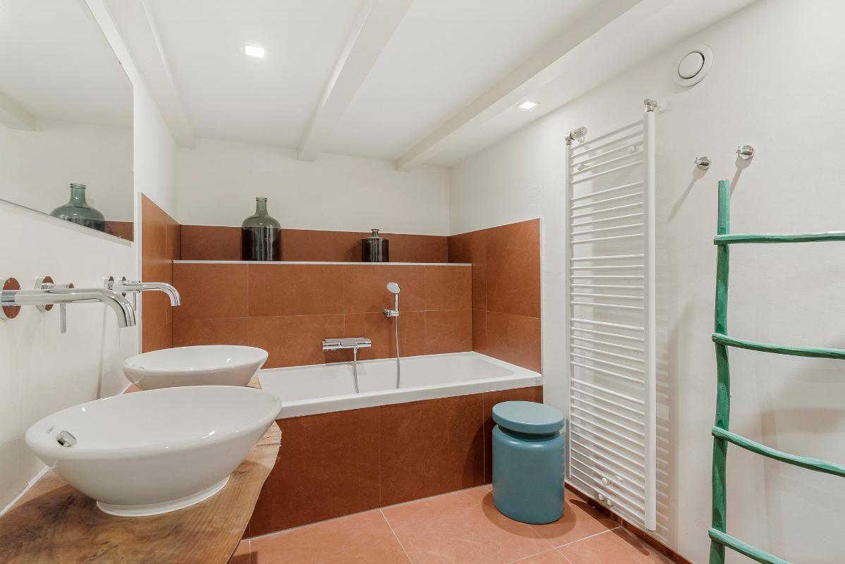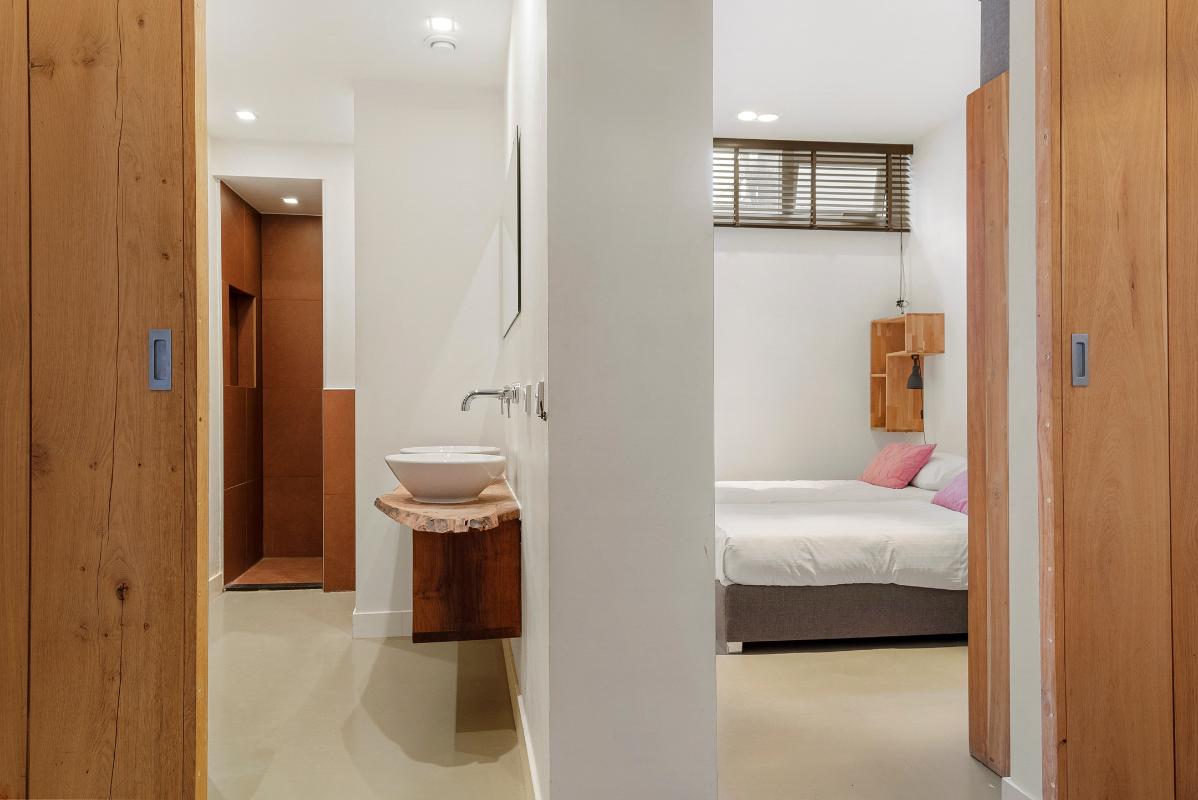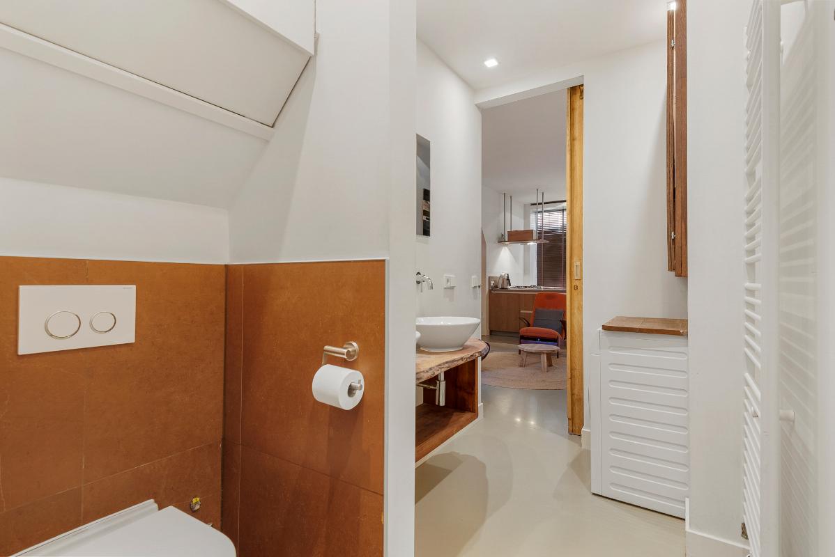 Aan de achterzijde van het appartement bevinden zich de badkamer en het separate toilet. Deze badkamer is uitgerust met een comfortabele regendouche, een wastafel met dubbele waskommen, toilet, een designradiator en de aansluiting voor de wasmachine. Tevens bevindt aan de achterzijde van de woning de eerste ruime slaapkamer.
