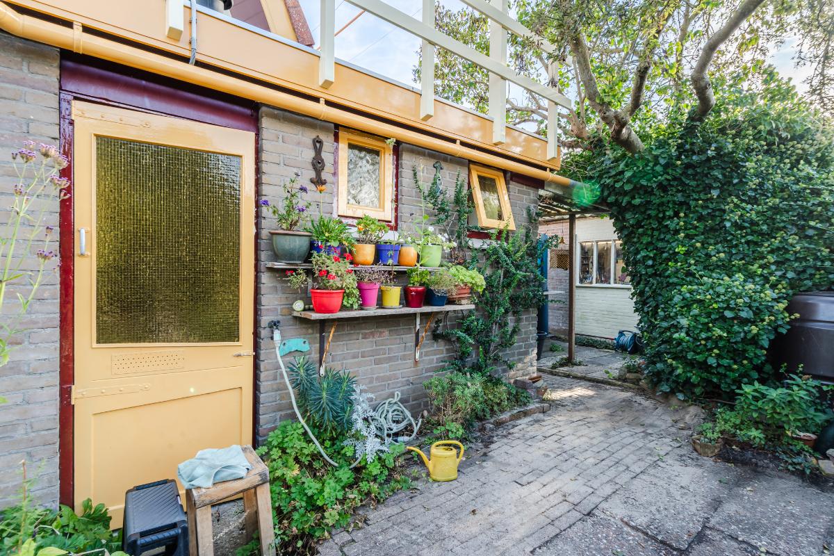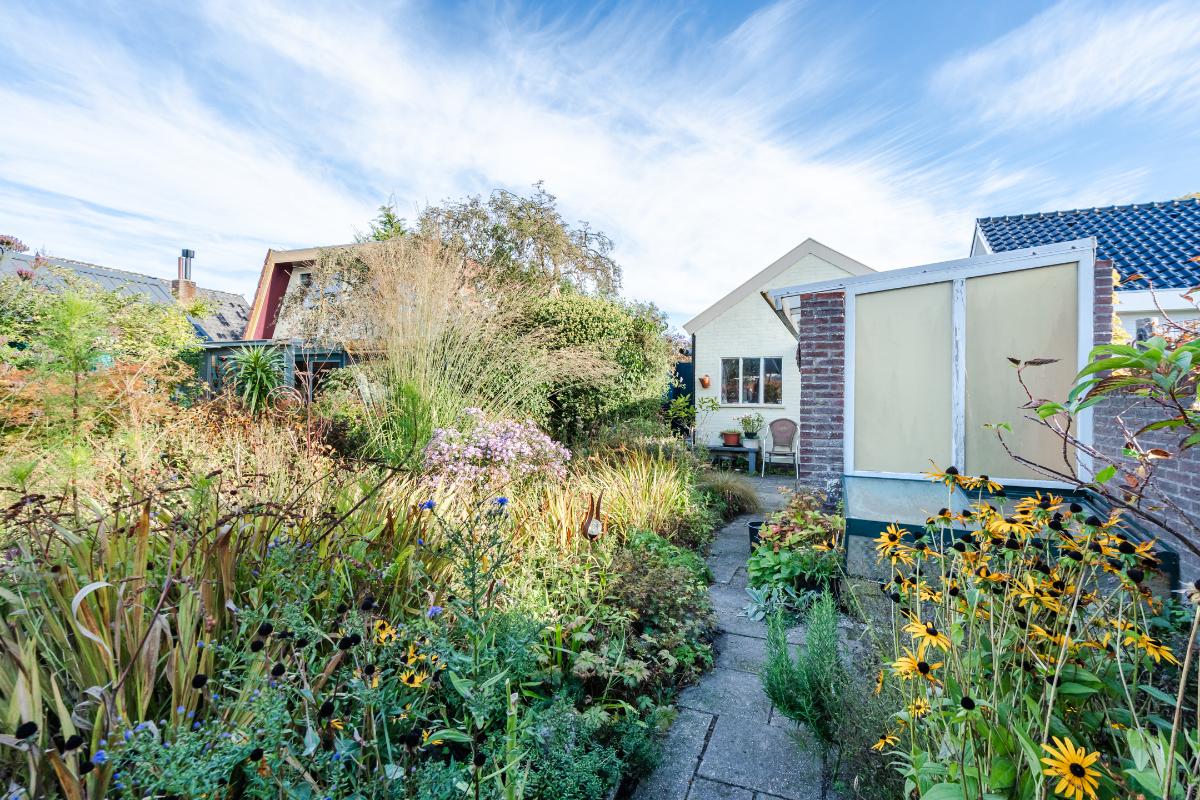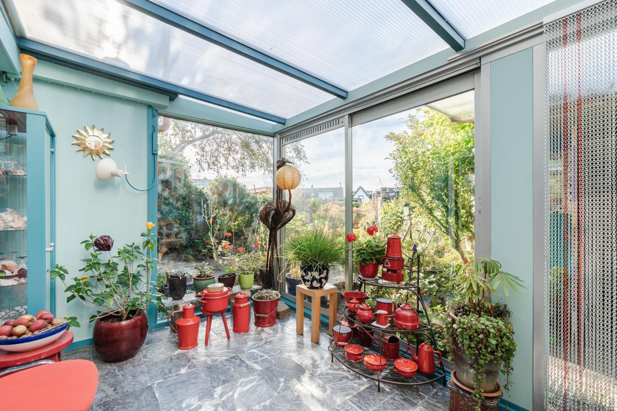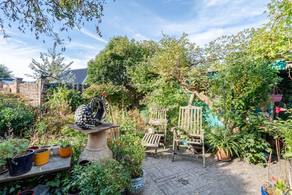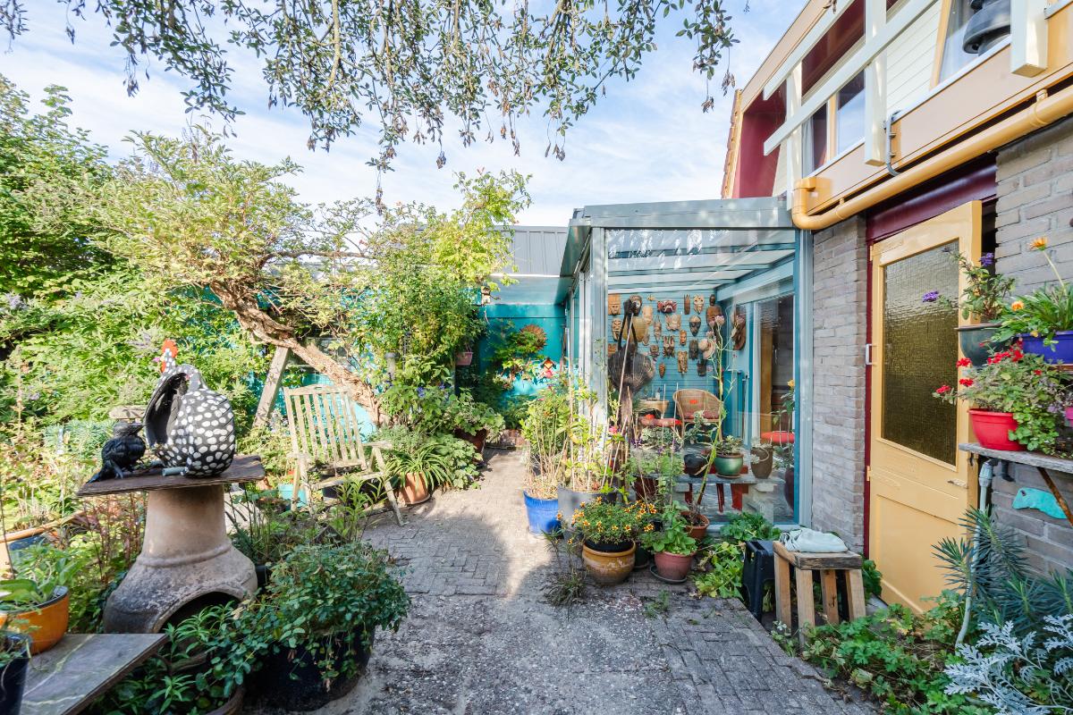 Aan de keuken is een serre gebouwd waar je bij de eerste zonnestralen heerlijk kunt toeven. De serre geeft op haar beurt weer toegang tot de tuin. De tuin in bloemenrijk aangelegd en goed gelegen ten opzichte van de zon. Achter in de tuin staat een stenen berging. Aan de straatzijde staat een vrijstaande stenen garage/berging. Nog meer informatie over deze woning is te vinden op amsteldijk14.nl