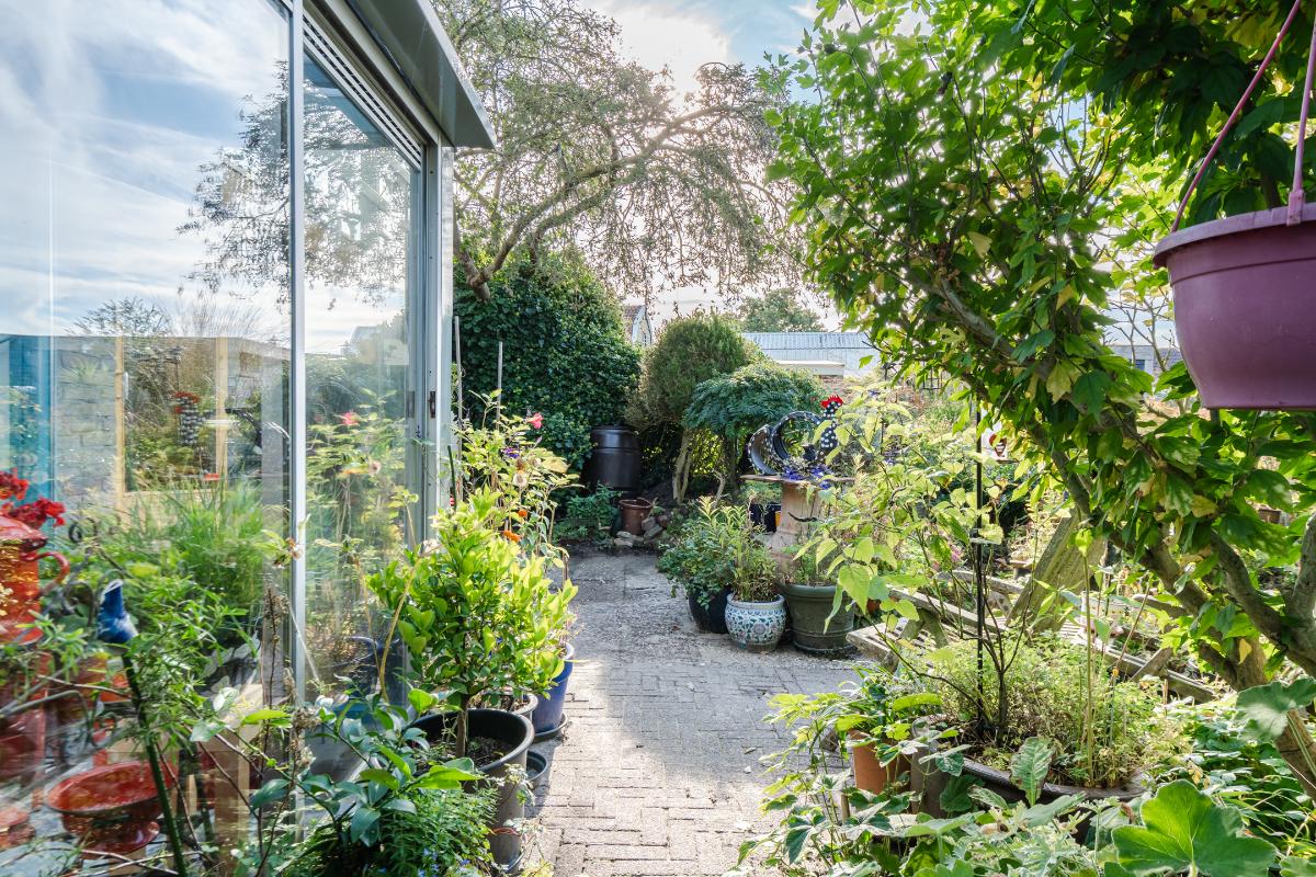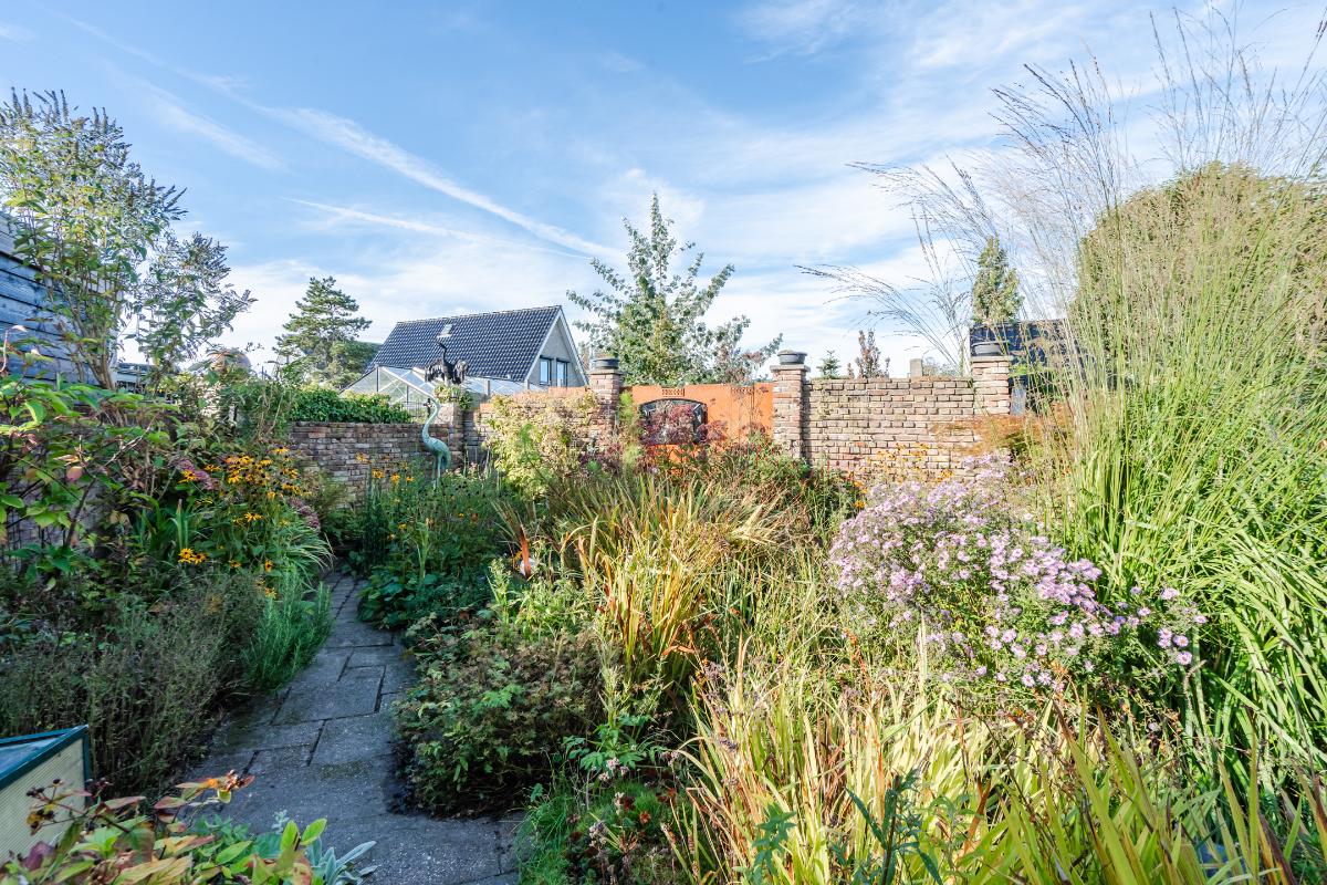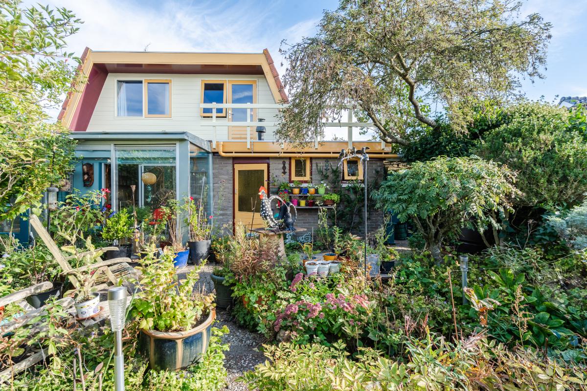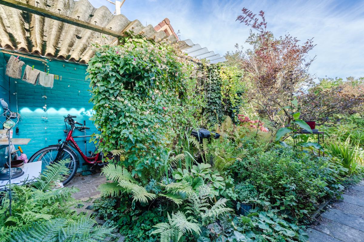 Aan de keuken is een serre gebouwd waar je bij de eerste zonnestralen heerlijk kunt toeven. De serre geeft op haar beurt weer toegang tot de tuin. De tuin in bloemenrijk aangelegd en goed gelegen ten opzichte van de zon. Achter in de tuin staat een stenen berging. Aan de straatzijde staat een vrijstaande stenen garage/berging. Nog meer informatie over deze woning is te vinden op amsteldijk14.nl