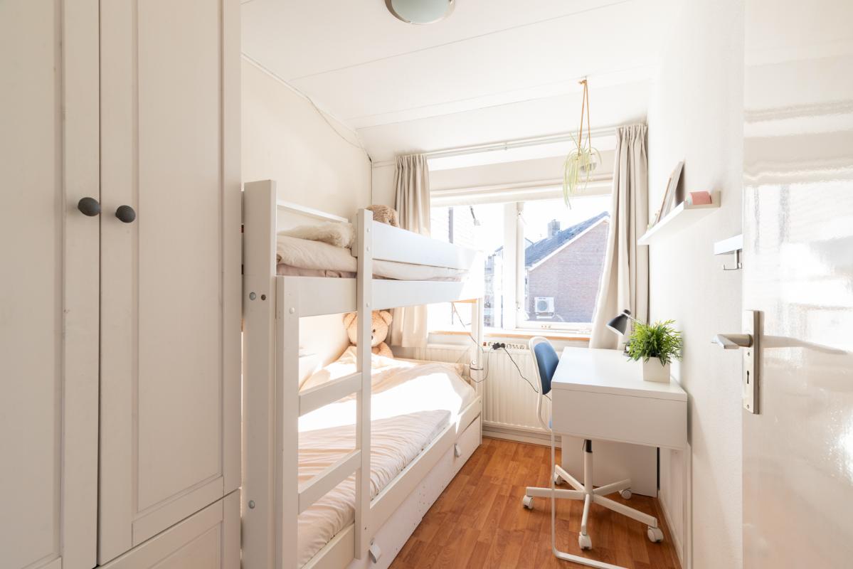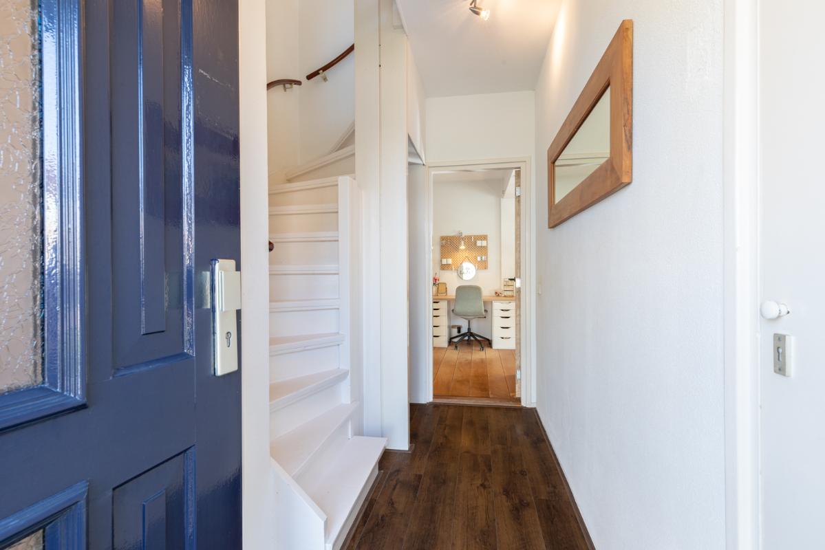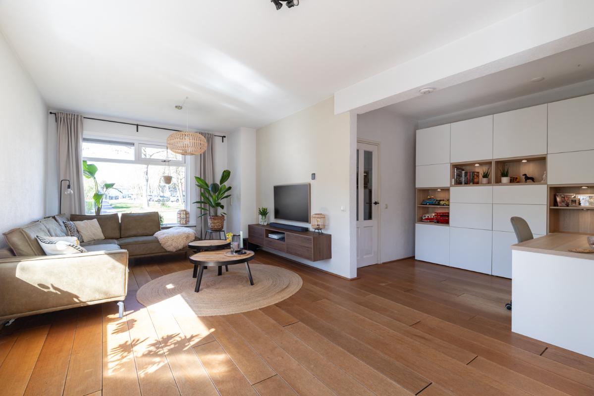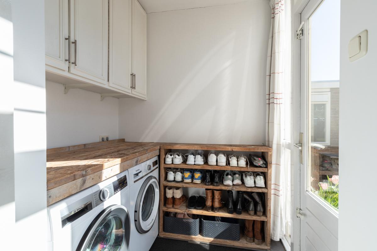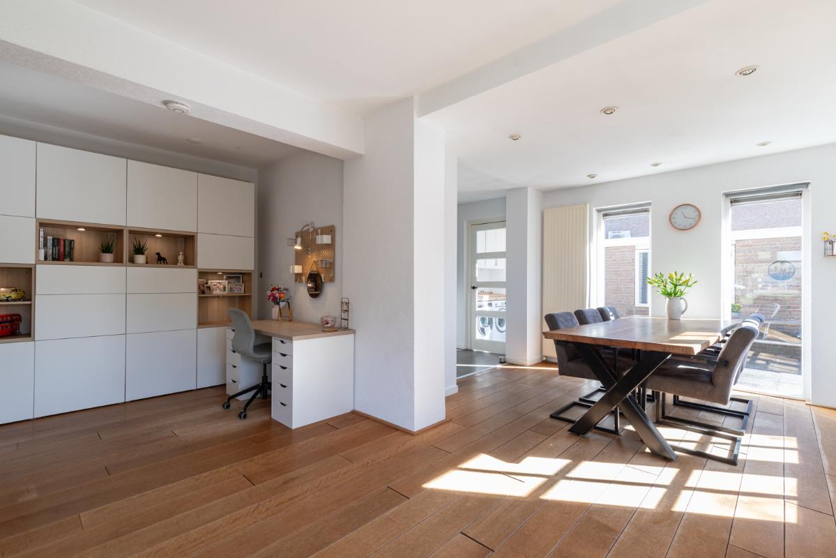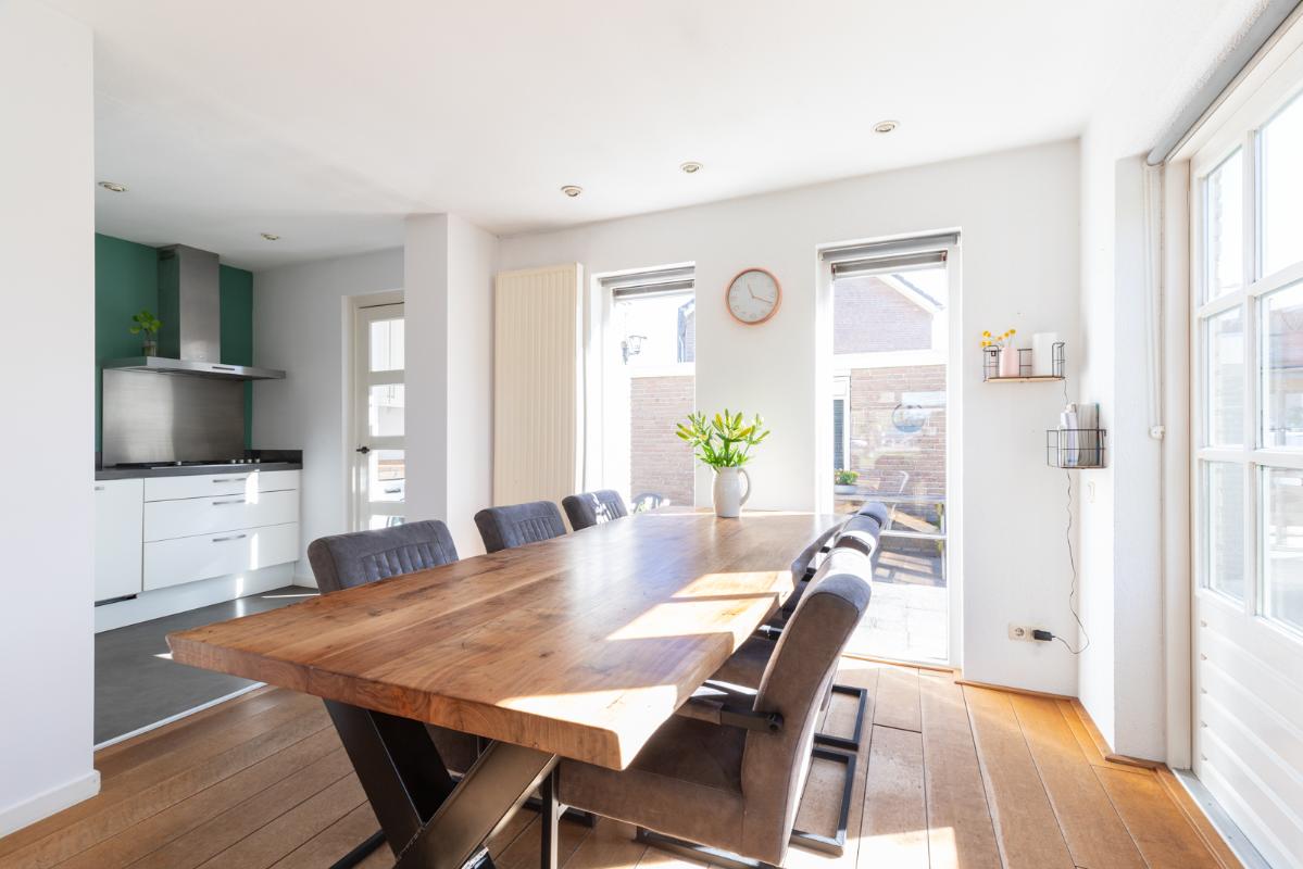 INDELING: Begane grond: hal/entree met toilet (wandcloset); een ruime en lichte woonkamer met halfopen woonkeuken (circa 44m²) met dubbele deuren naar de tuin. De moderne keuken is voorzien van een 5-pits gaskookplaat, afzuigschouw, koelkast, combi-oven, vaatwasser en veel kast- en werkruimte. Vanuit de keuken toegang tot de bijkeuken met wasmachine/droger-opstelling en deur naar de tuin. Eerste verdieping: overloop; 3 keurige slaapkamers (circa 13, 8 en 6m²) en een compacte moderne badkamer met inloopdouche en wastafelmeubel. Tweede verdieping: via vlizotrap bereikbare bergzolder.