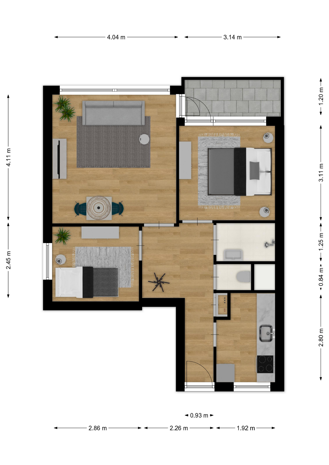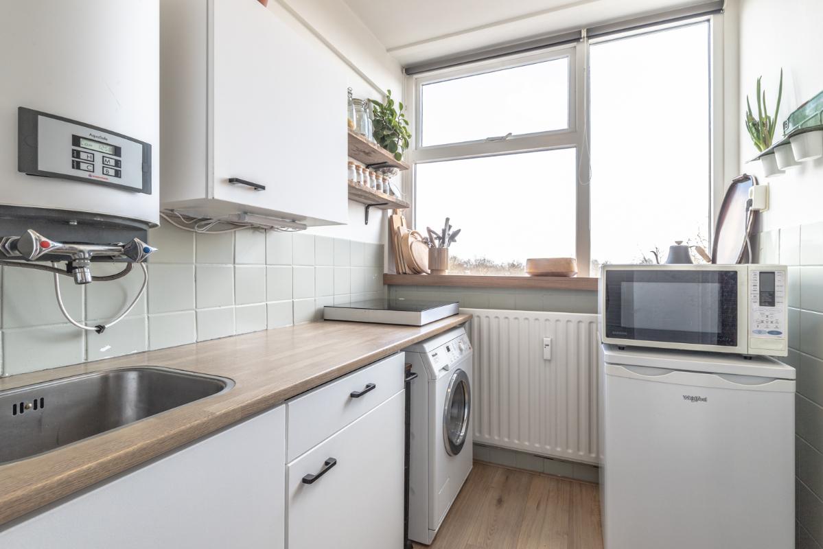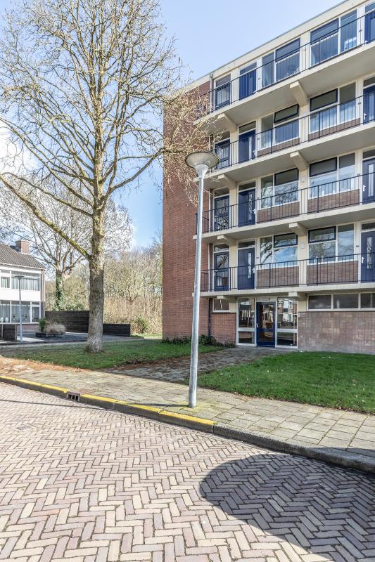 INDELING: Begane grond: Centrale (afgesloten) hal/entree met intercom, lift en trappenhuis. Naast een eigen berging van 10m² is er ook een gezamenlijke fietsenstalling. 4e etage: Entree/hal; een heerlijke lichte woonkamer (circa 17m²) met toegang tot het balkon op het zuiden. Vanuit de woonkamer een prachtig vrij uitzicht op het Lariksbos. De nette (eenvoudige) keuken is voorzien van spoelgelegenheid en veel kastruimte. Vanuit de hal toegang tot de twee slaapkamers (circa 10 en 7m²), het toilet en de badkamer (voorzien van douche en wastafel). De grootste slaapkamer heeft ook een deur naar het balkon.