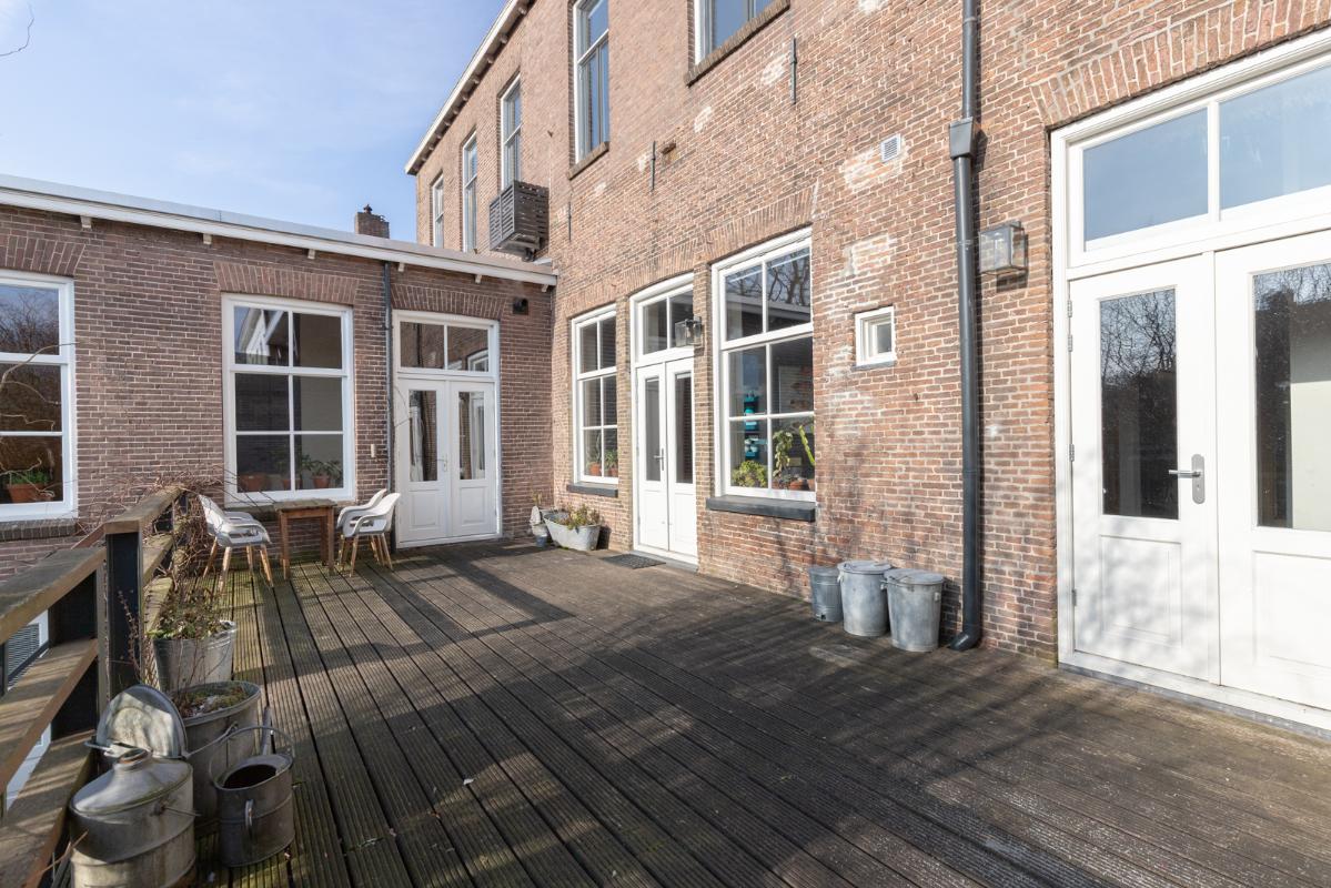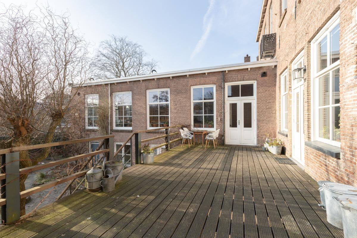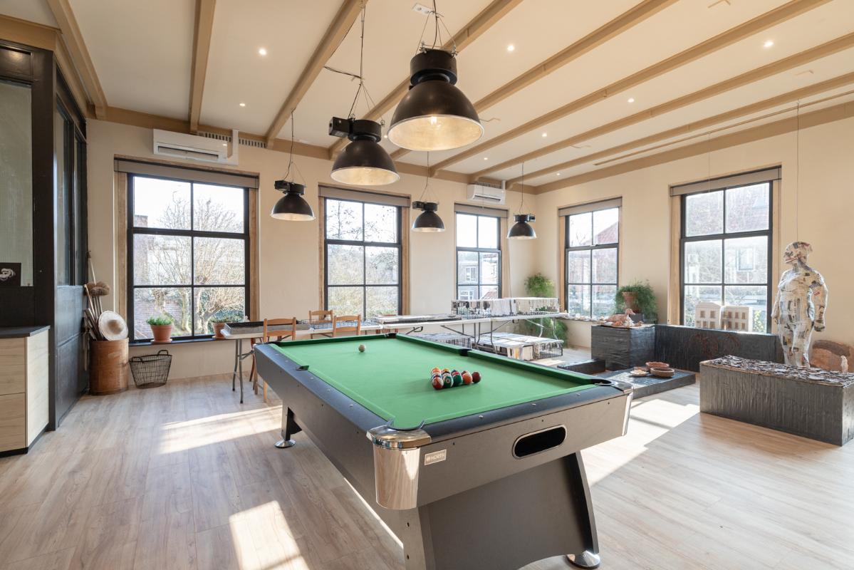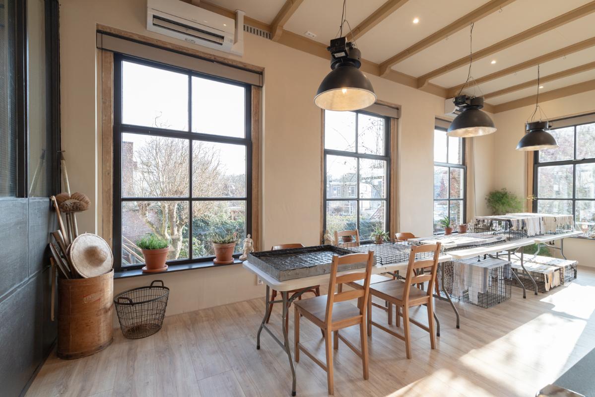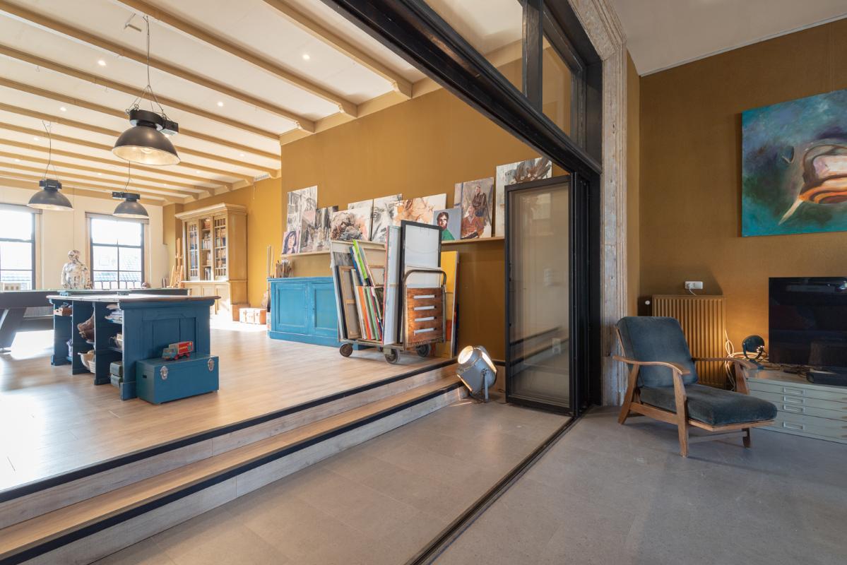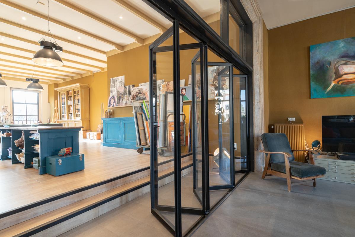 INDELING: BEGANE GROND: entree/tochtportaal met prachtige eikenhouten glas-in-lood deuren. Vanuit de imposante hal toegang tot het toilet, de woonkamer en de achtergelegen veranda. De riante living met halfopen keuken van ruim 100m² is een heerlijke ruimte vol warmte & sfeer en met een fraai uitzicht op de Vaart en de Witterbrug. De halfopen handgemaakte robuuste keuken (2023) is voorzien van een koel-vriescombinatie, inductiefornuis met oven, afzuigschouw, vaatwasser en veel kast- en werkruimte. Vanuit de keuken direct toegang de veranda (ca. 40m²) op het zuiden middels de dubbele tuindeuren. Het atelier (ca. 84m²) bevindt zich aan de tuinzijde en is middels een prachtige glaswand af te sluiten van de living. In 2024 is deze voormalige eetzaal van het Tehuis geheel verbouwd tot een prachtige multifunctionele ruimte. Dankzij het hoge plafond en grote ramen een heerlijke ruimte met prachtige lichtinval en een fraai uitzicht op de tuin. Het geheel wordt verwarmd (en gekoeld) middels twee airco-units en er is een extra keukenblok met spoelgelegenheid en koelkast. Vanaf de begane grond is er rechtstreeks toegang tot het gastenverblijf in het souterrain.