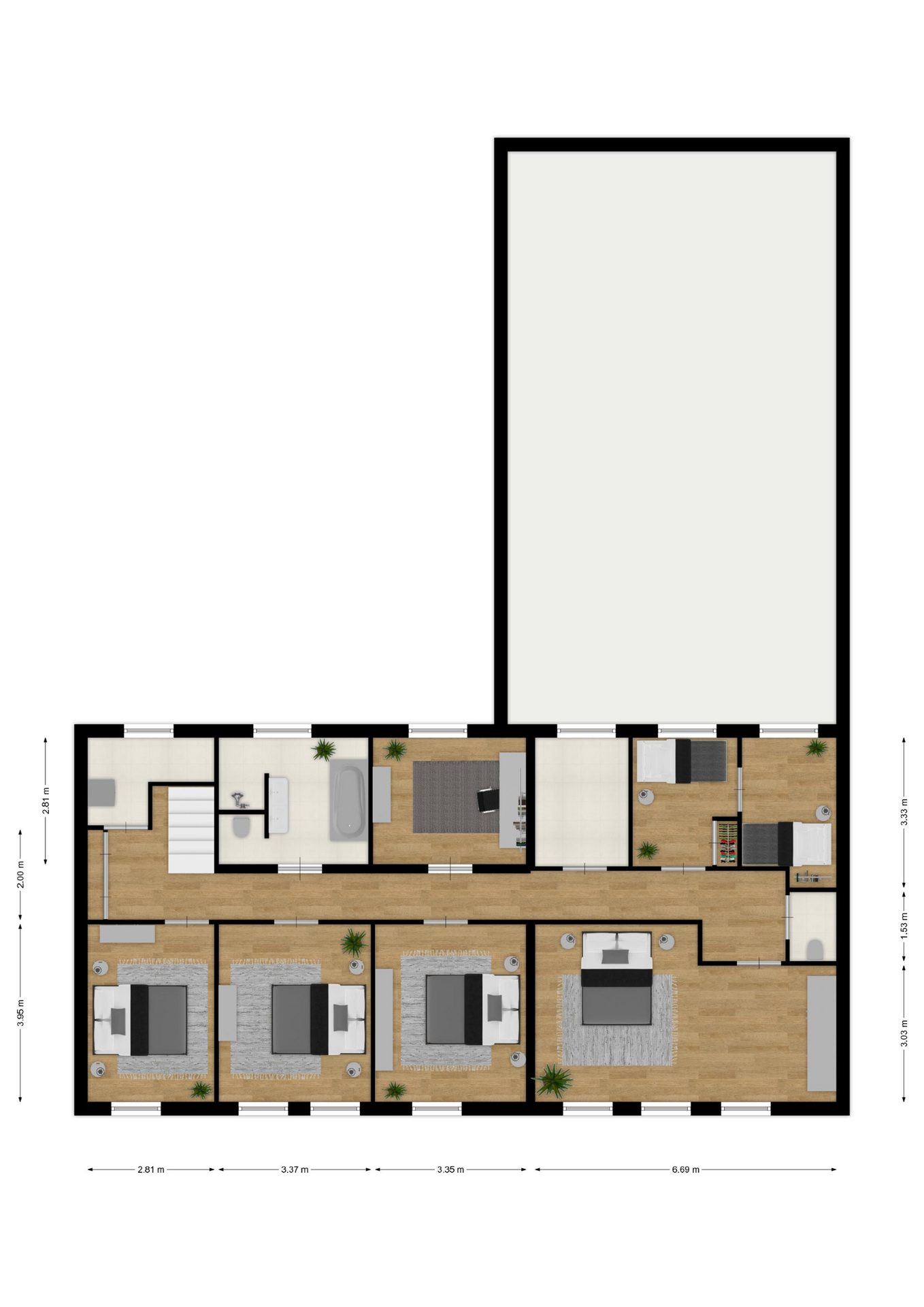 EERSTE VERDIEPING: overloop/gang met toilet; 6 ruime slaapkamers (ca. 24, 13, 13, 12, 11 en 10m²) en een moderne badkamer voorzien van een ligbad, dubbel wastafelmeubel, ruime inloopdouche en wandcloset. In de voormalige badkamer is al het leidingwerk nog aanwezig en hier kan eventueel een tweede badkamer worden gerealiseerd.