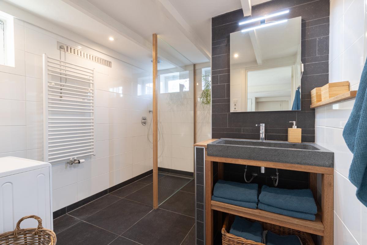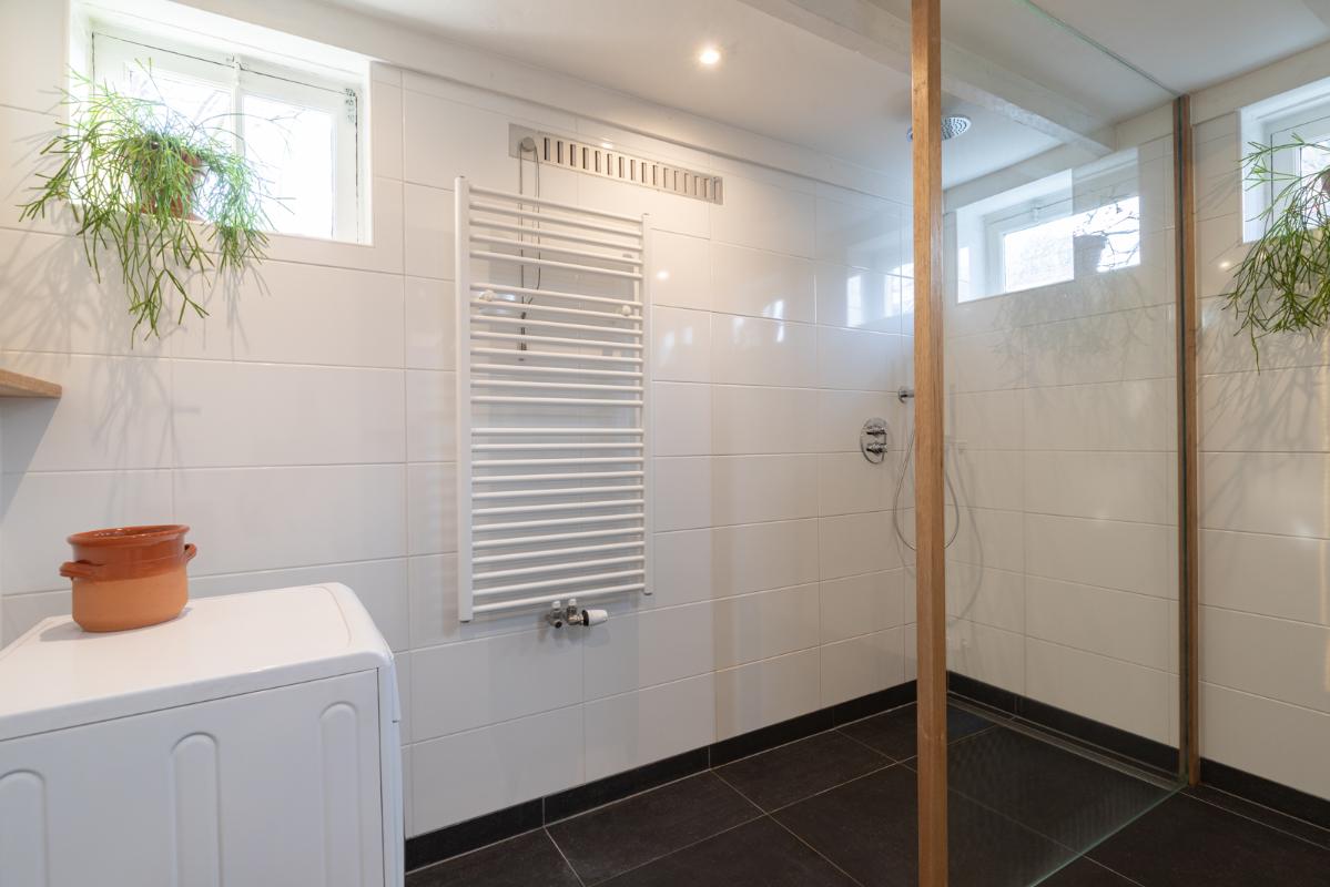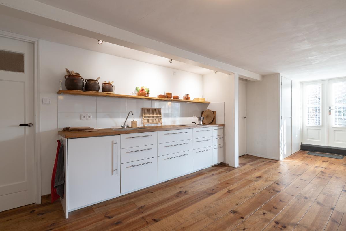 GASTENVERBLIJF IN HET SOUTERRAIN (tuinzijde): Entree middels trap vanaf de begane grond; een ruime woonkamer met open keuken (ca. 50m²) met tweemaal dubbele deuren naar tuin. De keuken (2017) is voorzien van een koelkast, kookplaat en spoelgelegenheid. Vanuit de woonkamer toegang tot de slaapkamer (ca. 18m²) en de moderne badkamer voorzien van inloopdouche, wastafelmeubel en wandcloset. De rest van het souterrain aan de voorzijde is ook van binnenuit te bereiken.