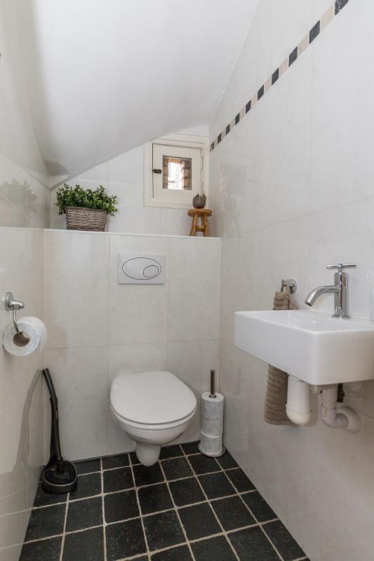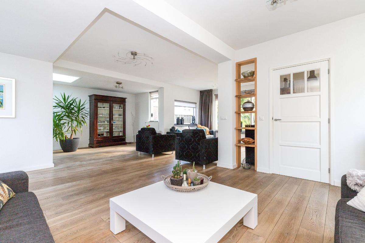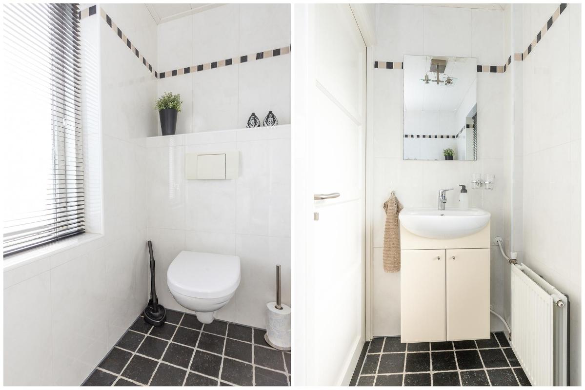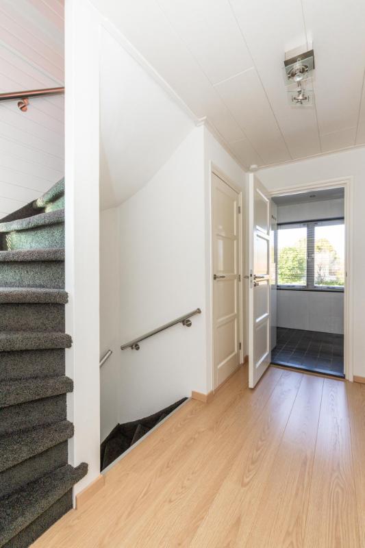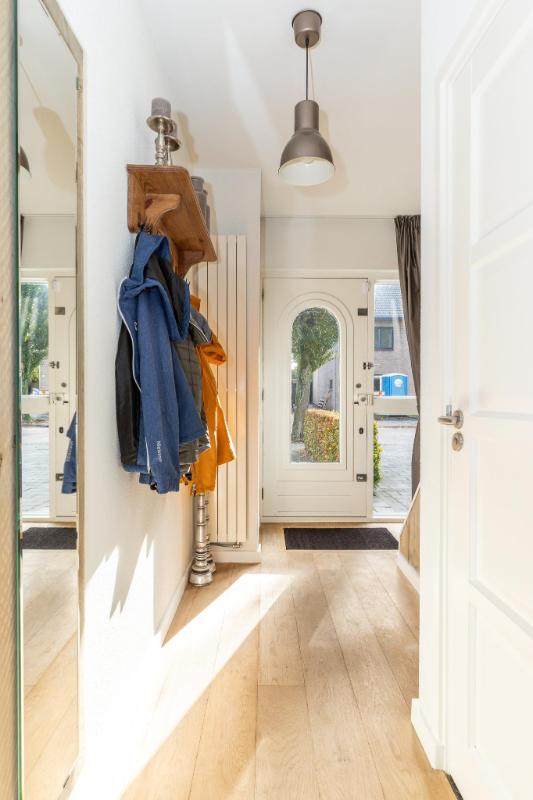 Entree/hal Via een van sierbestrating voorzien looppad door de voortuin bereikt u de voordeur en komt u in de hal. De voortuin is voorzien van diverse beplanting en links van de woning is een oprit die plaats biedt aan 3 auto's. De hal is voorzien van een eikenhouten vloer, de wanden zijn voorzien van spachtelputz en het plafond is voorzien van stucwerk. Vanuit de hal zijn de woonkamer, toiletruimte, bergkast, meterkast (met 8 groepen, 2 aardlekschakelaars en glasvezelaansluiting) en trapopgang naar de eerste verdieping bereikbaar. De toiletruimte beschikt over een hangend toilet en een fonteintje. De wanden zijn betegeld in een neutrale kleurstelling, de vloer is voorzien van zwarte tegels en het plafond is voorzien van stucwerk.
