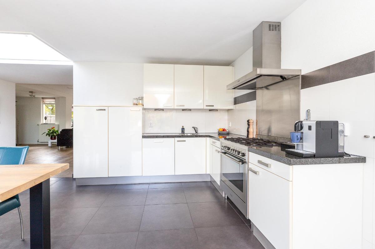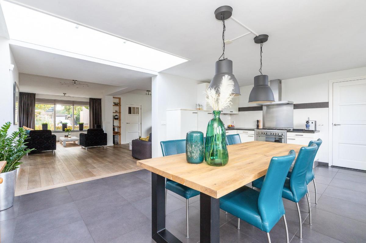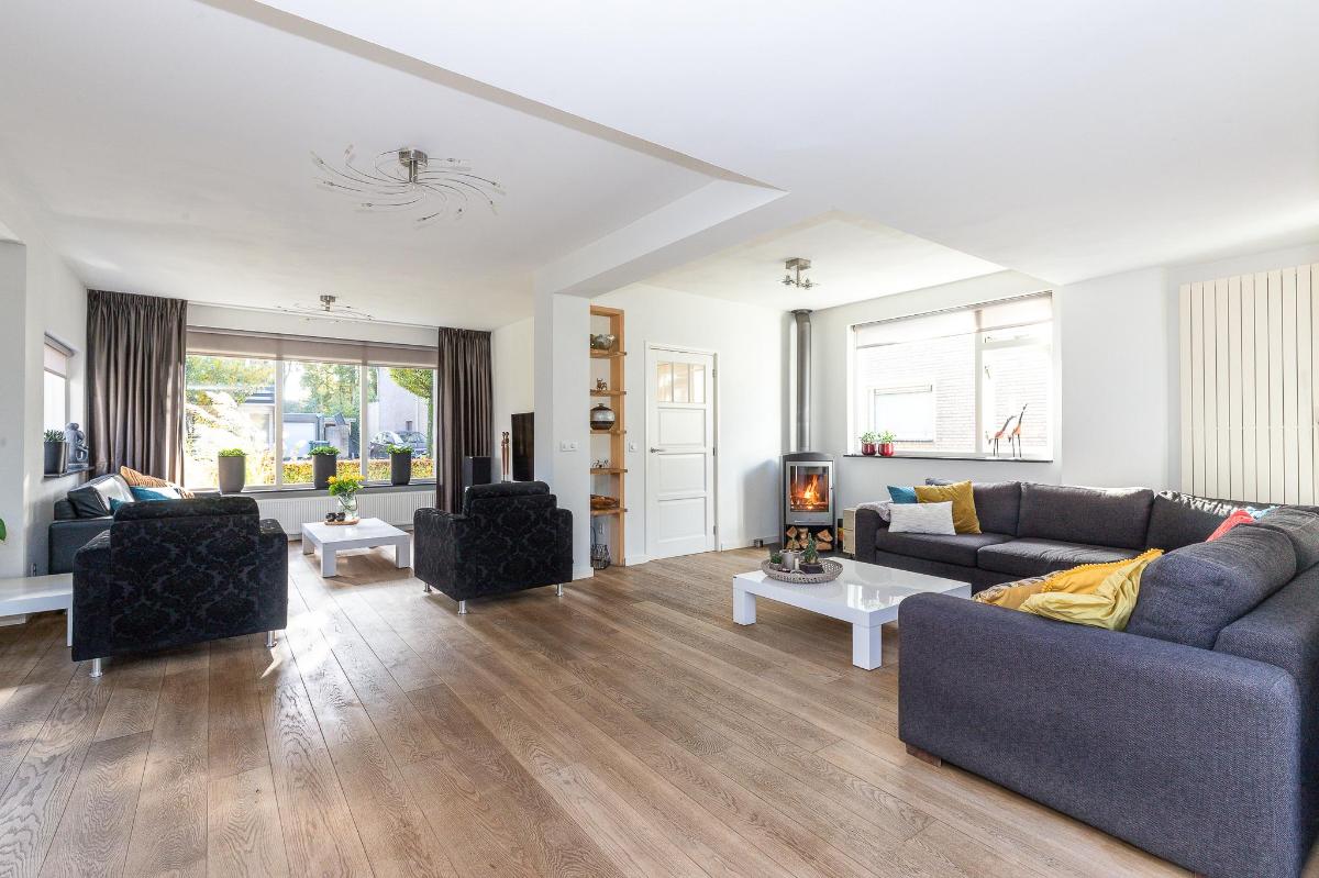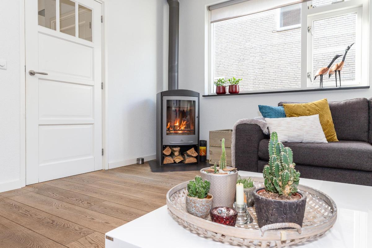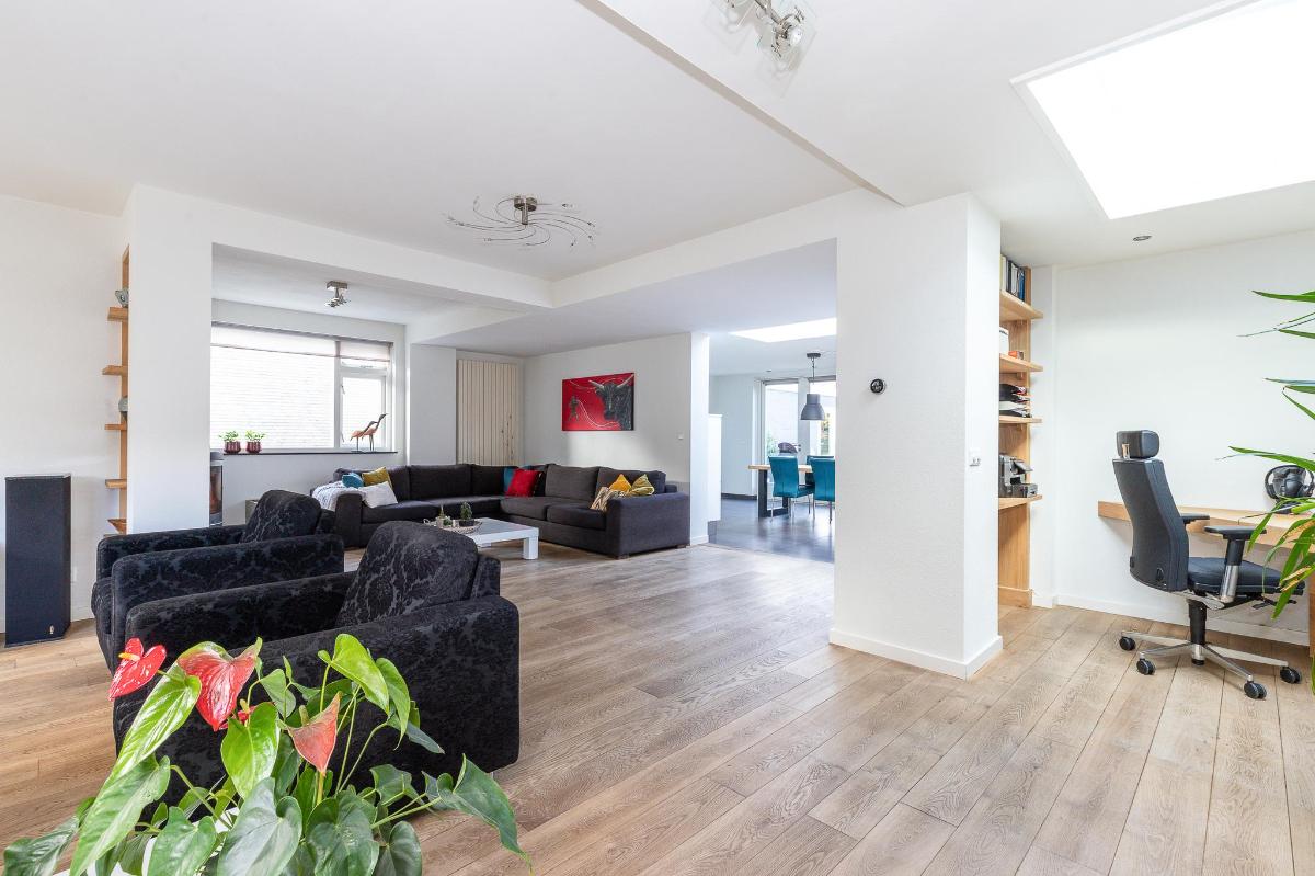 Woonkamer Zeer ruime woonkamer van circa 52 m² groot. De ruimte is, in de huidige indeling, verdeeld in 3 gedeeltes. Een zitgedeelte met sfeervolle houtkachel, een TV gedeelte en een kantoor. Doordat de ruimte zo groot is kan de ruimte op diverse manieren ingedeeld worden. Aan de achterzijde van de woonkamer heeft u toegang tot het kookgedeelte. De volledige woonkamer is voorzien van dezelfde eikenhouten vloer als in de hal, de wanden zijn voorzien van spachtelputz en het plafond is voorzien van stucwerk.