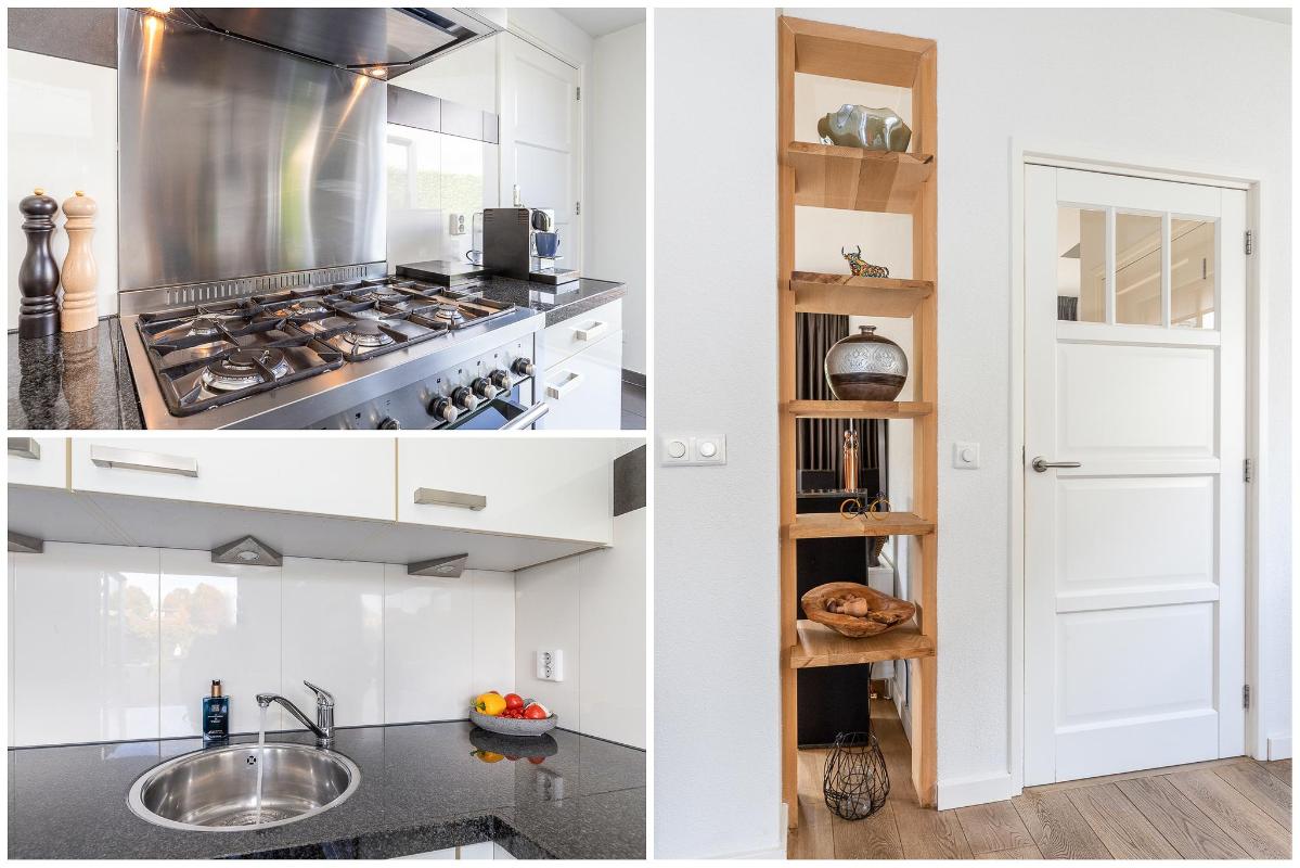 Keuken De keuken is gelegen aan de achterzijde van de woning en staat in een L-opstelling. De keuken is voorzien van diverse inbouwapparatuur, te weten een 6-pits gasfornuis, oven, vaatwasser, koelkast en een spoelbak met mengkraan. Het aanrechtblad is van graniet en de achterwand is betegeld in een neutrale kleurstelling. De overige wanden zijn voorzien van spachtelputz, het plafond is voorzien van stucwerk en de vloer is voorzien van antracieten tegels en vloerverwarming. Vanuit de keuken heeft u via 2 openslaande tuindeuren toegang tot de achtertuin. Daarnaast heeft u vanuit de keuken ook toegang tot de praktijkruimte en de bijkeuken.